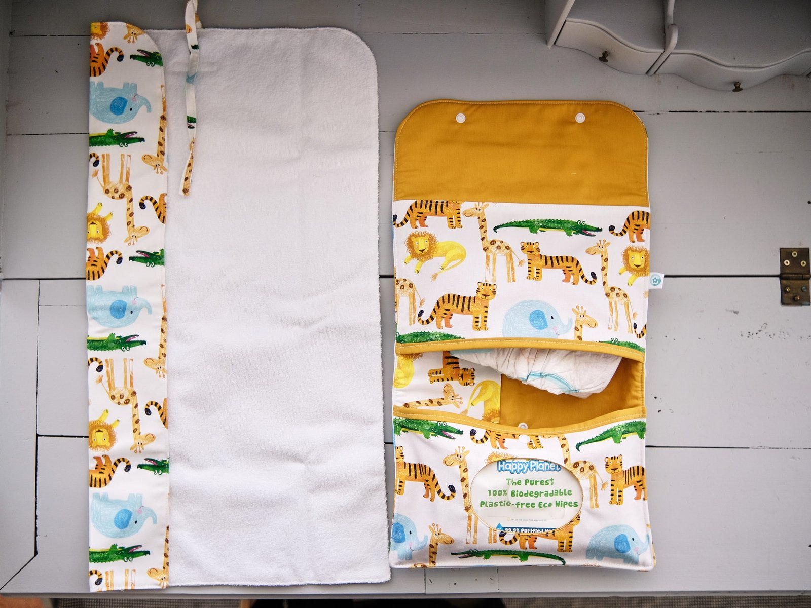 Muito útil para levar sempre dentro da mala. O trocador simples dobra-se e tem atilhos para ficar fechado. A zona onde deita o bebé é em turco, mas com o verso impermeável, para não repassar nada. Lava-se na máquina e fica pronto para voltar a usar.