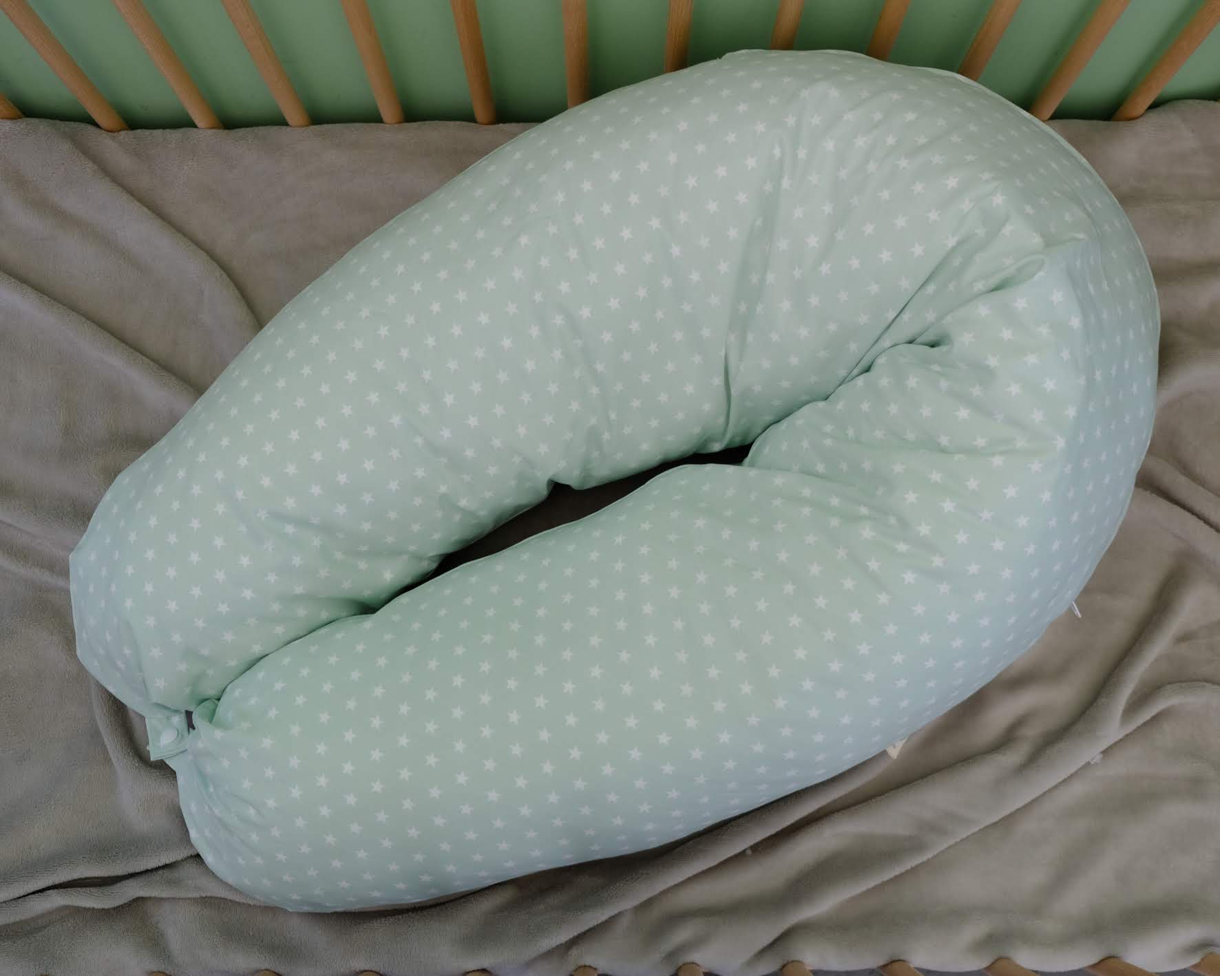 • Almofada de amamentação verde-água com estrelas brancas num berço