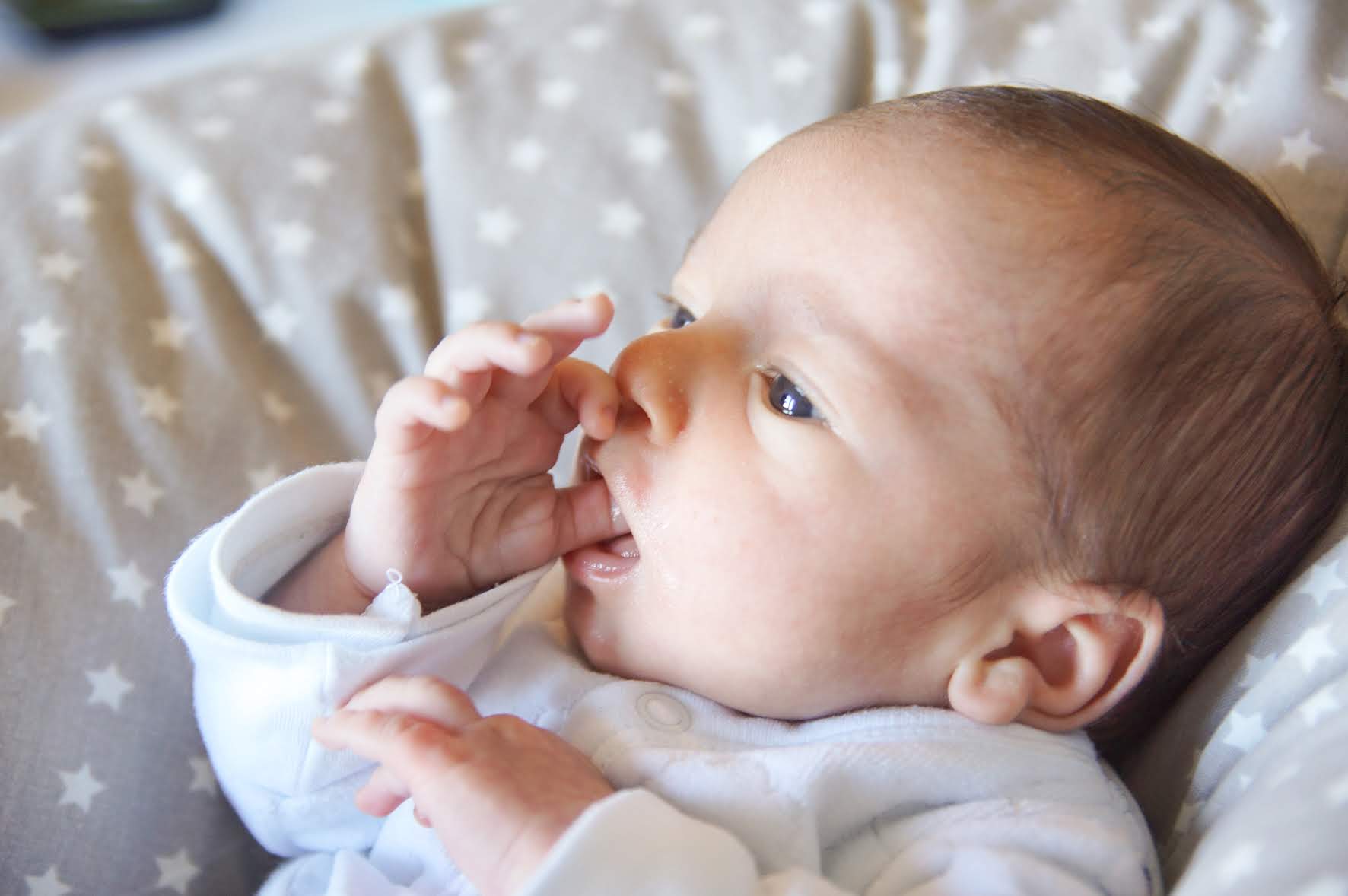 Bebé vestido de branco a morder o dedo, deitado numa almofada cinza com estrelas brancas