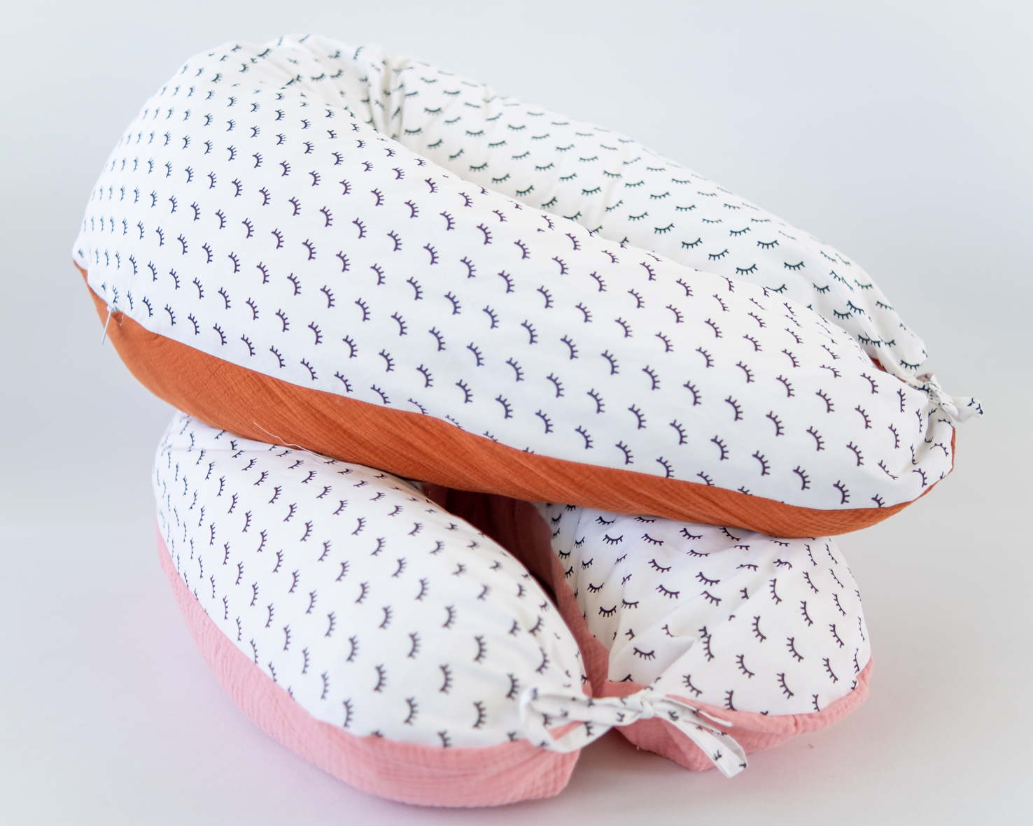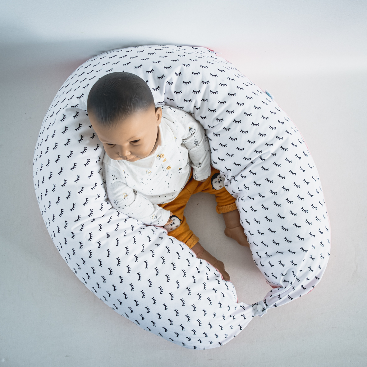Quando o bebé começa a sentar-se a almofada grande serve de apoio à volta do bebé, para o ajudar a manter uma posição correcta.