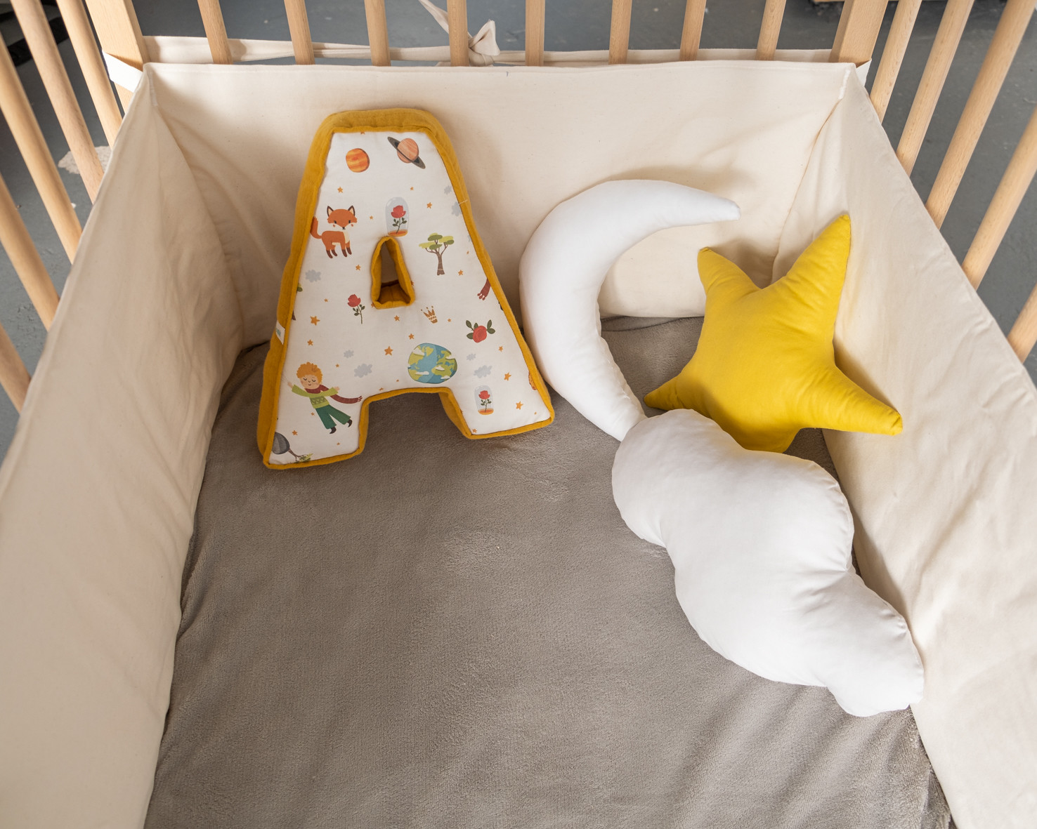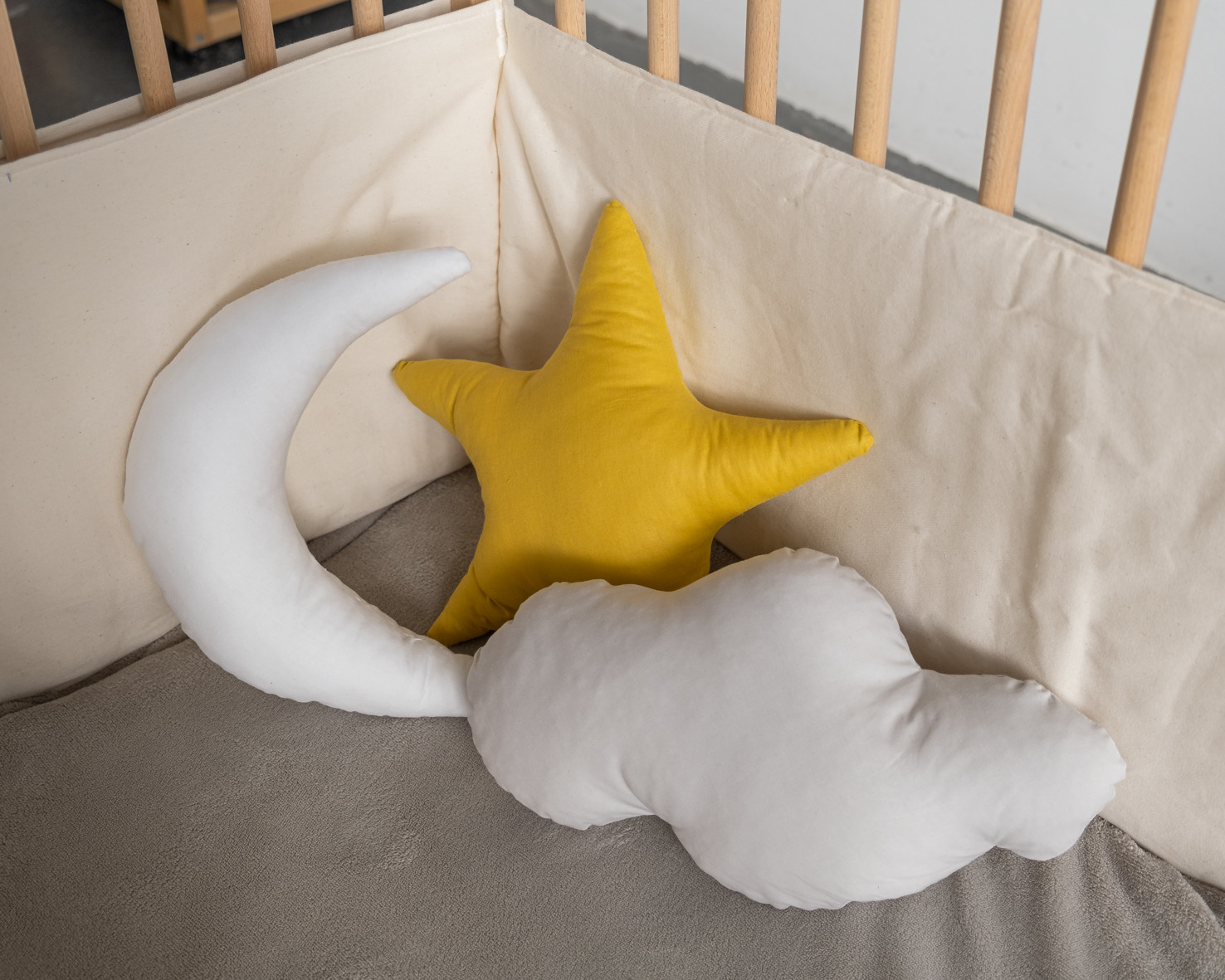 • Três almofadas decorativas em formas de lua, estrela e nuvem dentro de um berço de madeira
