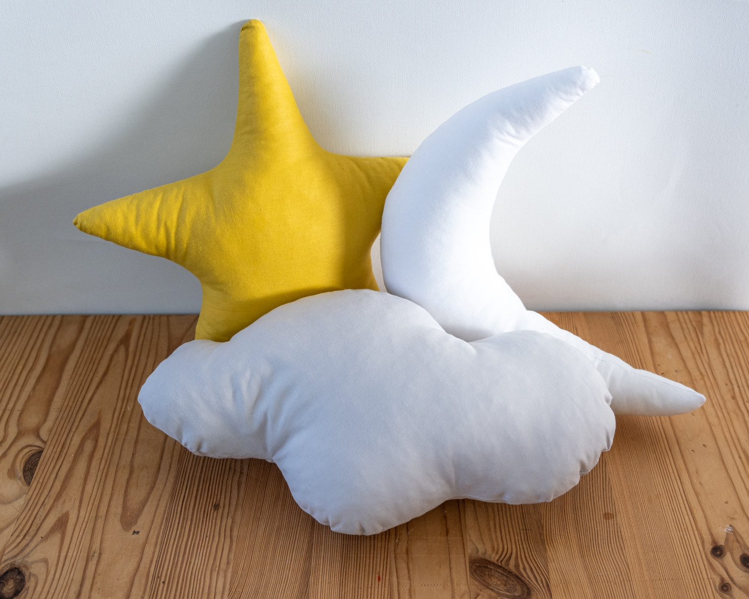 • Almofadas em forma de estrela, lua e nuvem sobre superfície de madeira