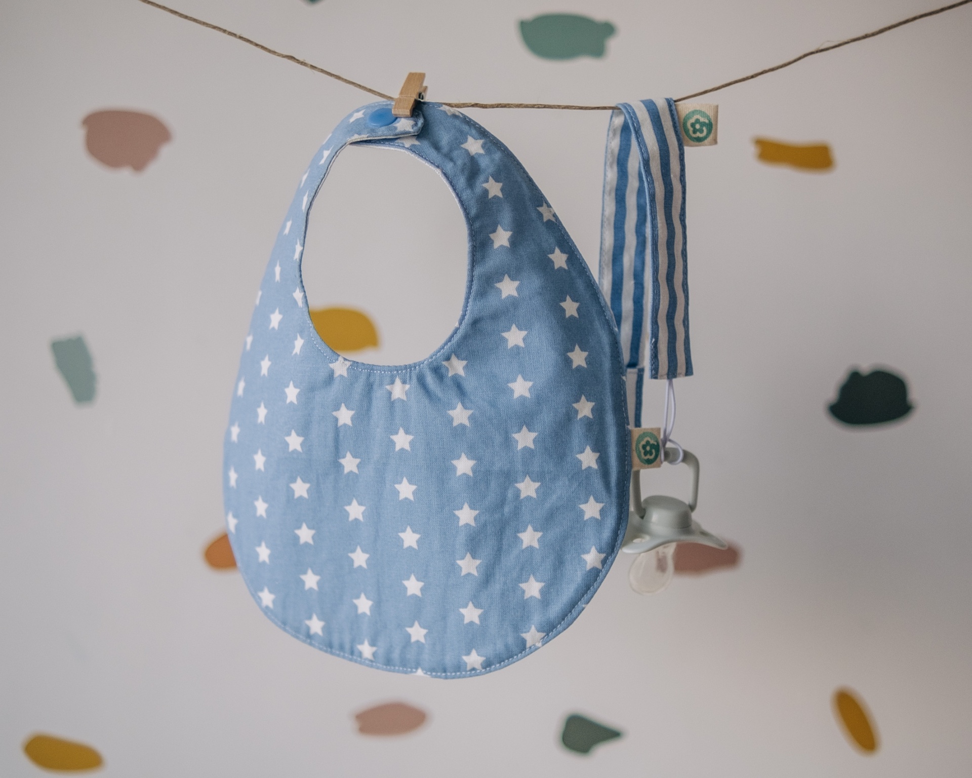 • Babete azul com estrelas brancas pendurado com acessórios de bebé e chupeta numa corda de estendal