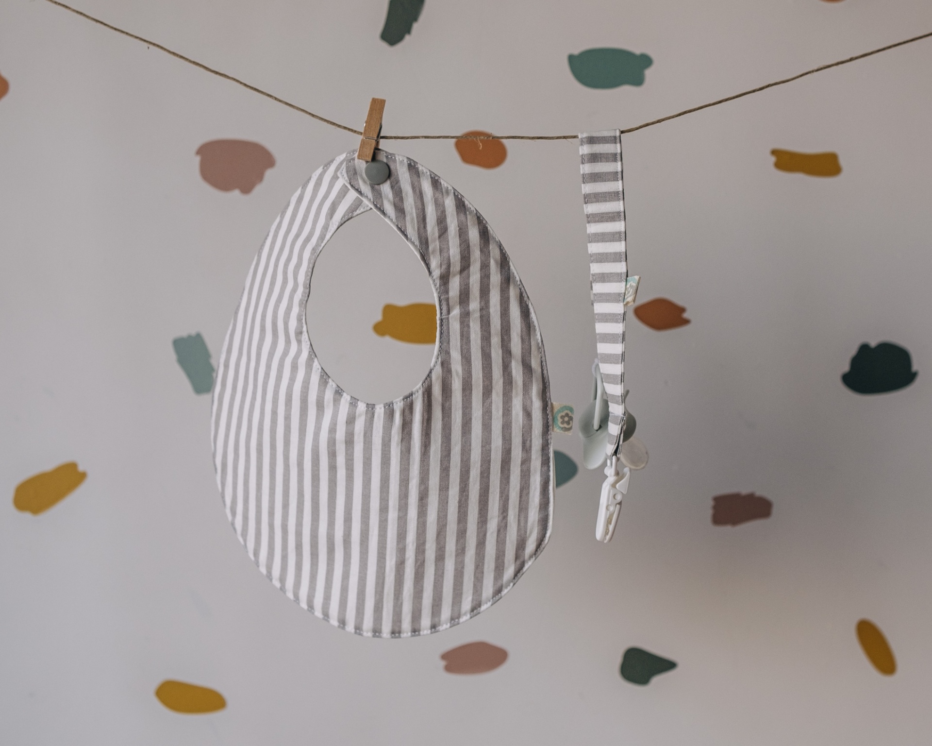• Babete redonda listrada cinzento e branco pendurada com fita listrada, parede branca com decalques coloridos