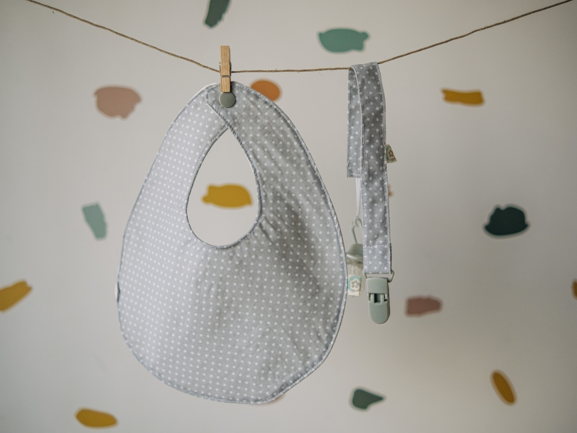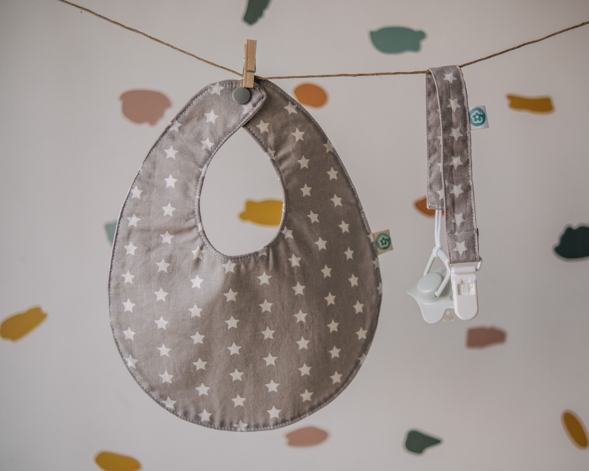 • Babete cinza claro com pontos brancos e mola pendurada num cordel com padrão de estrelas