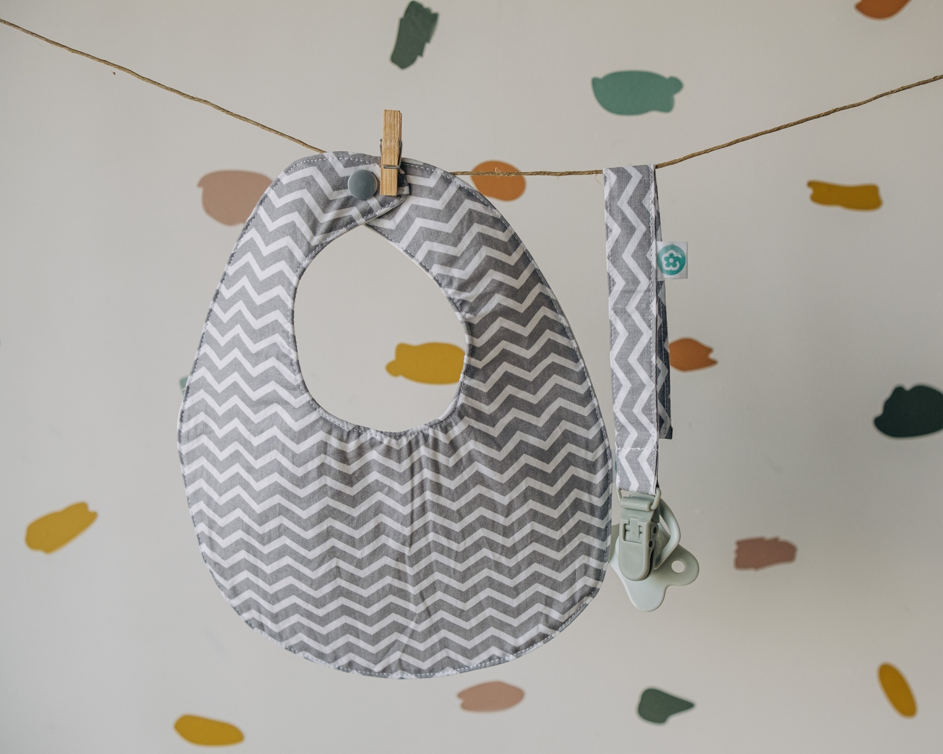 • Babete e prendedor de chupeta cinza e branco com padrão zig zag pendurados num fio com mola de madeira