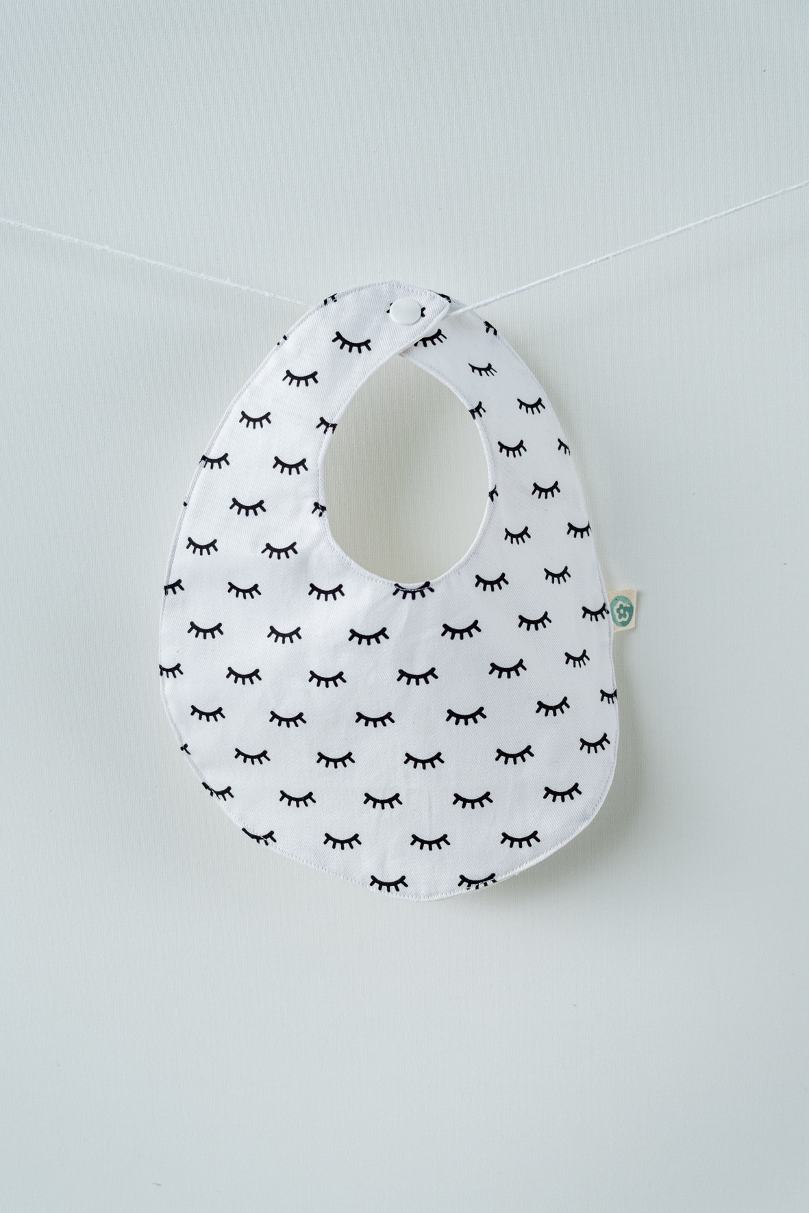 • Babete branco com padrão de cílios pretos pendurado