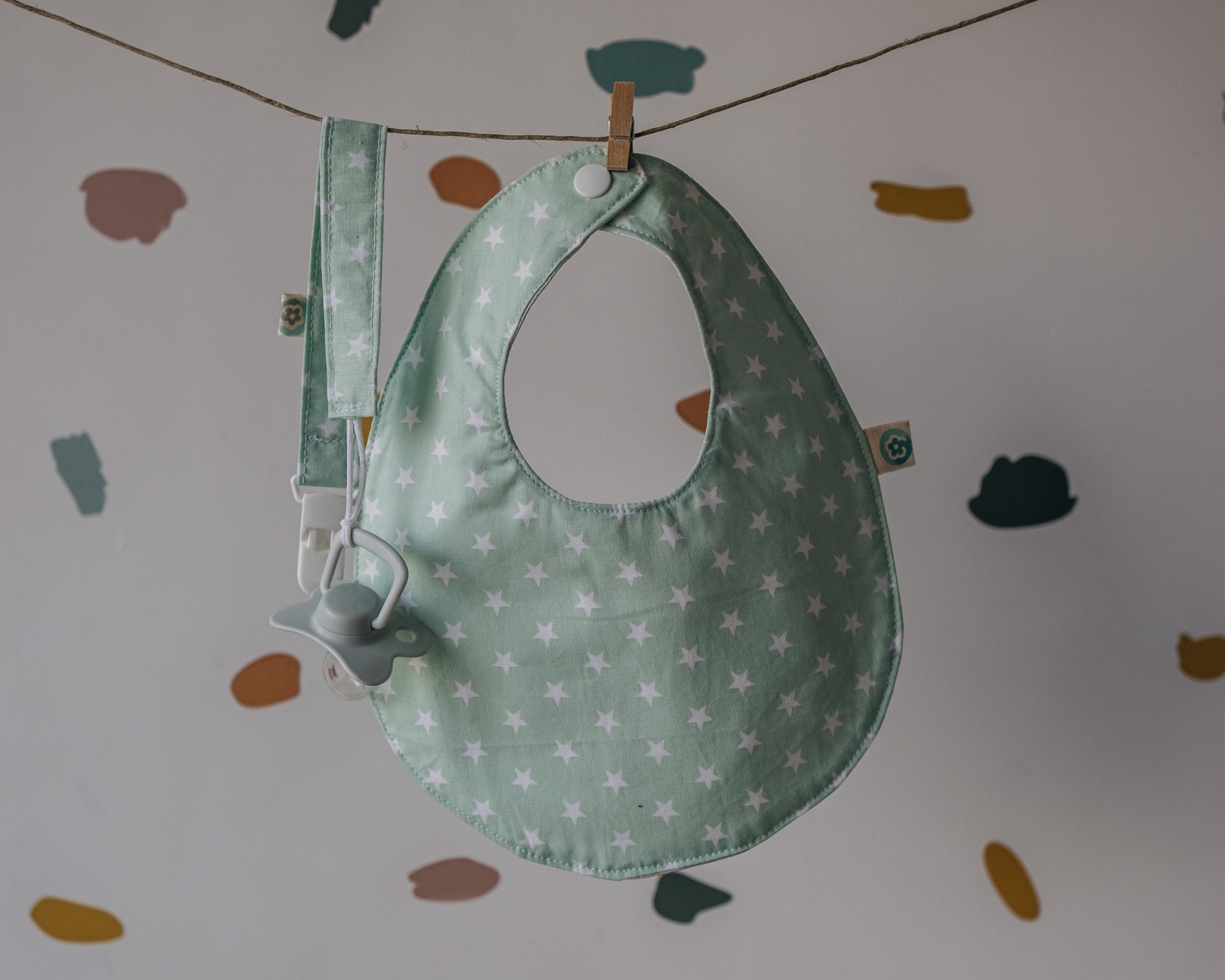 • Babete verde claro com estrelas brancas pendurado com chupeta e fita no varal