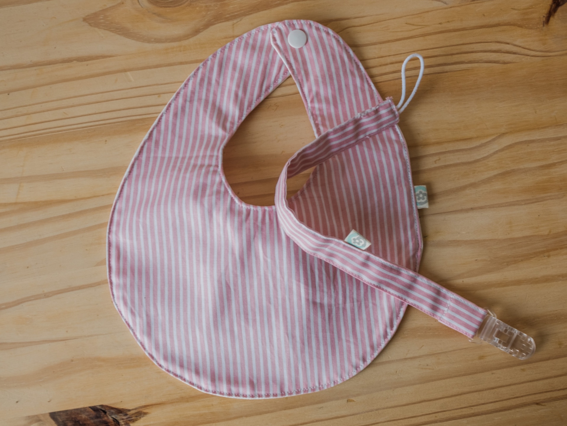 • Babete redondo de tecido rosa com riscas e faixa com fecho de mola
