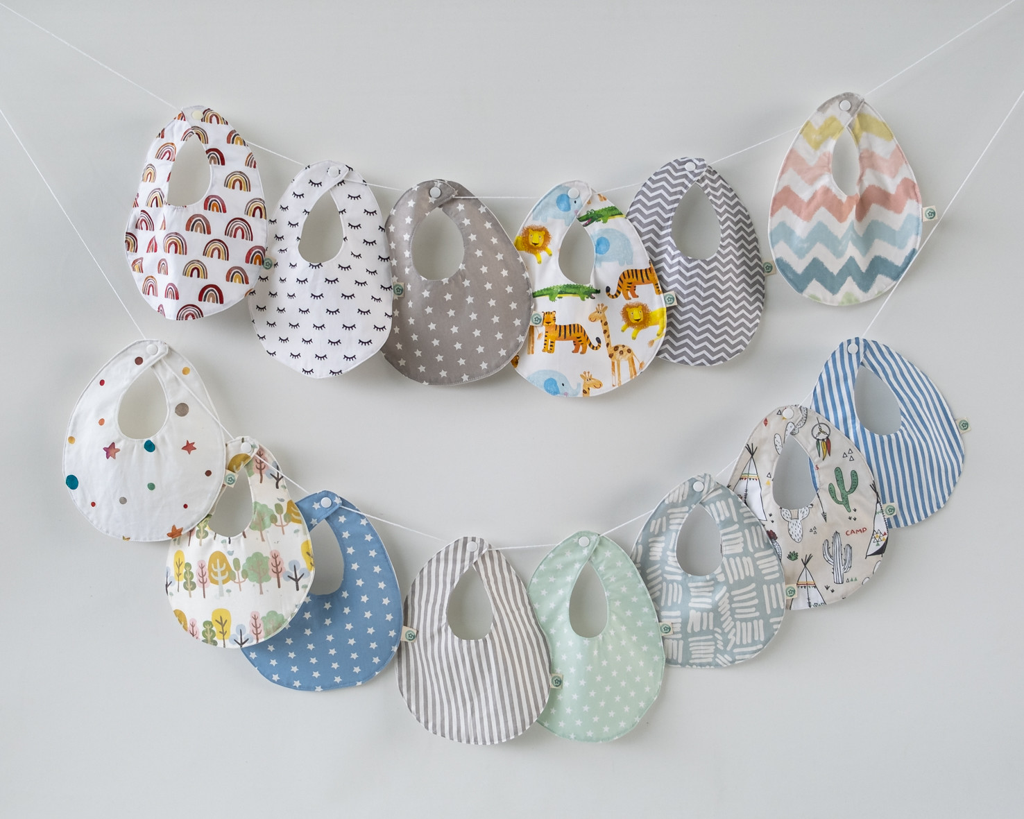• Onze babetes coloridos com vários padrões pendurados contra parede branca