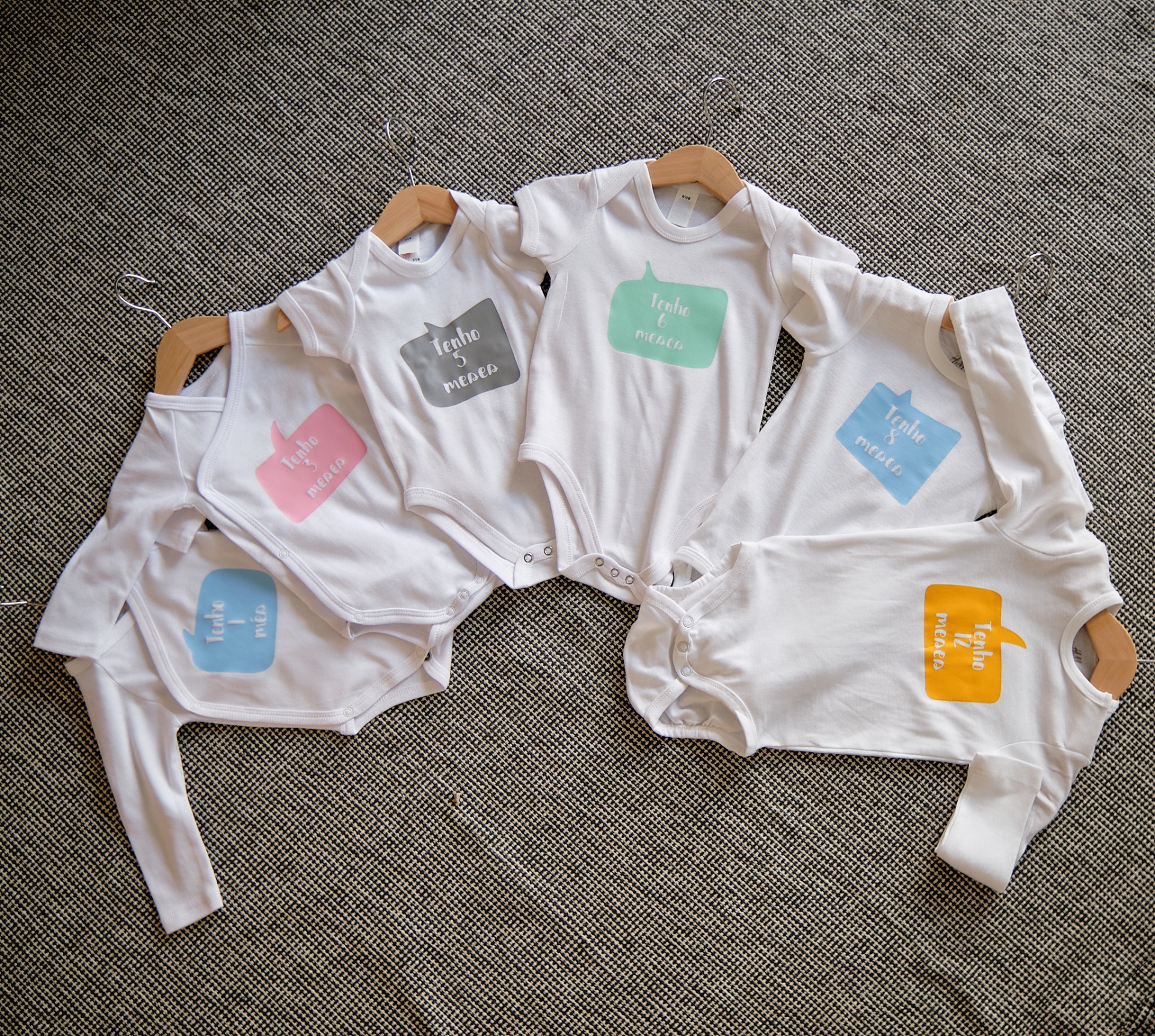 • Cinco bodies brancos para bebé com quadrados coloridos e texto em inglês no peito, pendurados em cabides de madeira