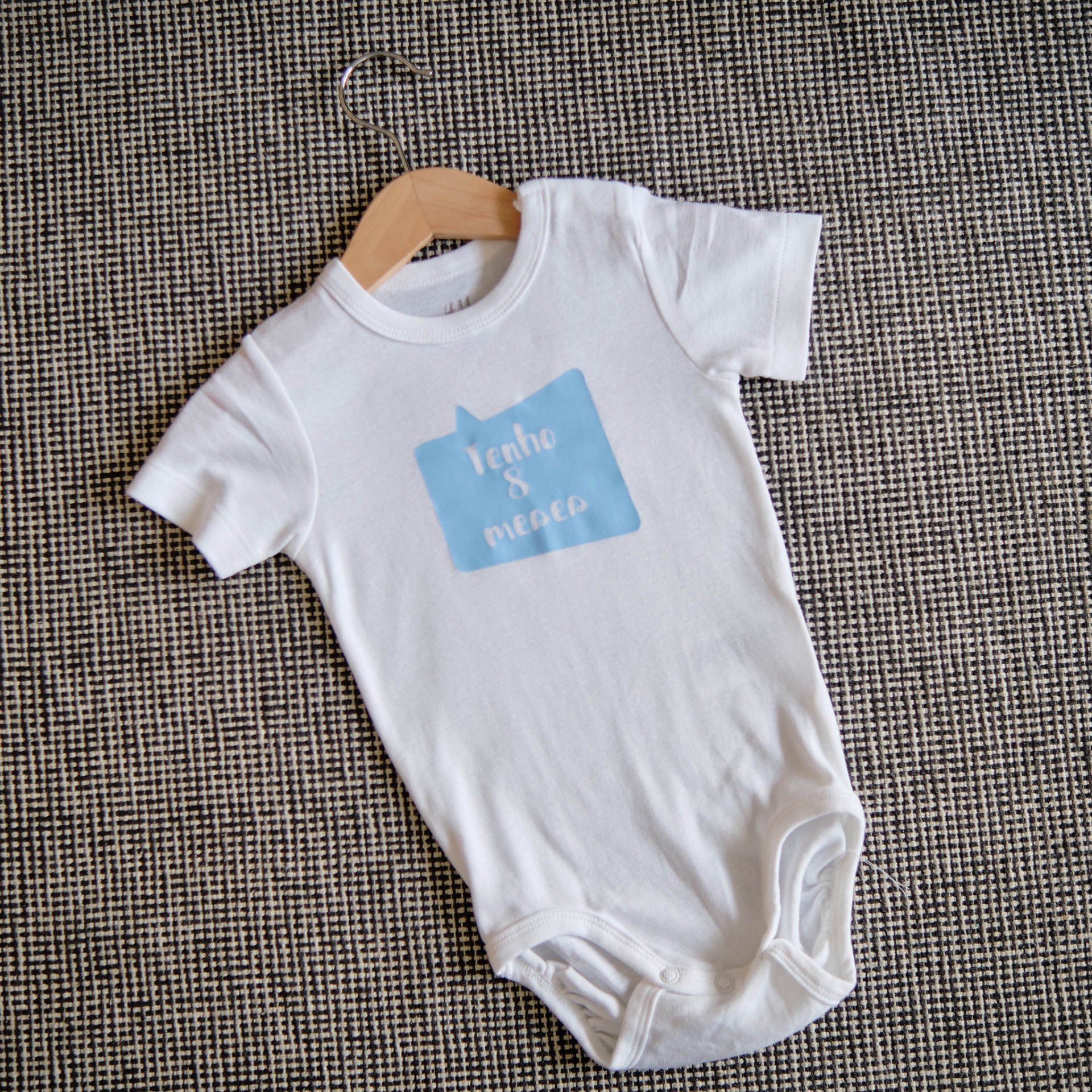 • Body branco de bebé com padrão azul quadrado e texto branco sobre superfície têxtil cinza