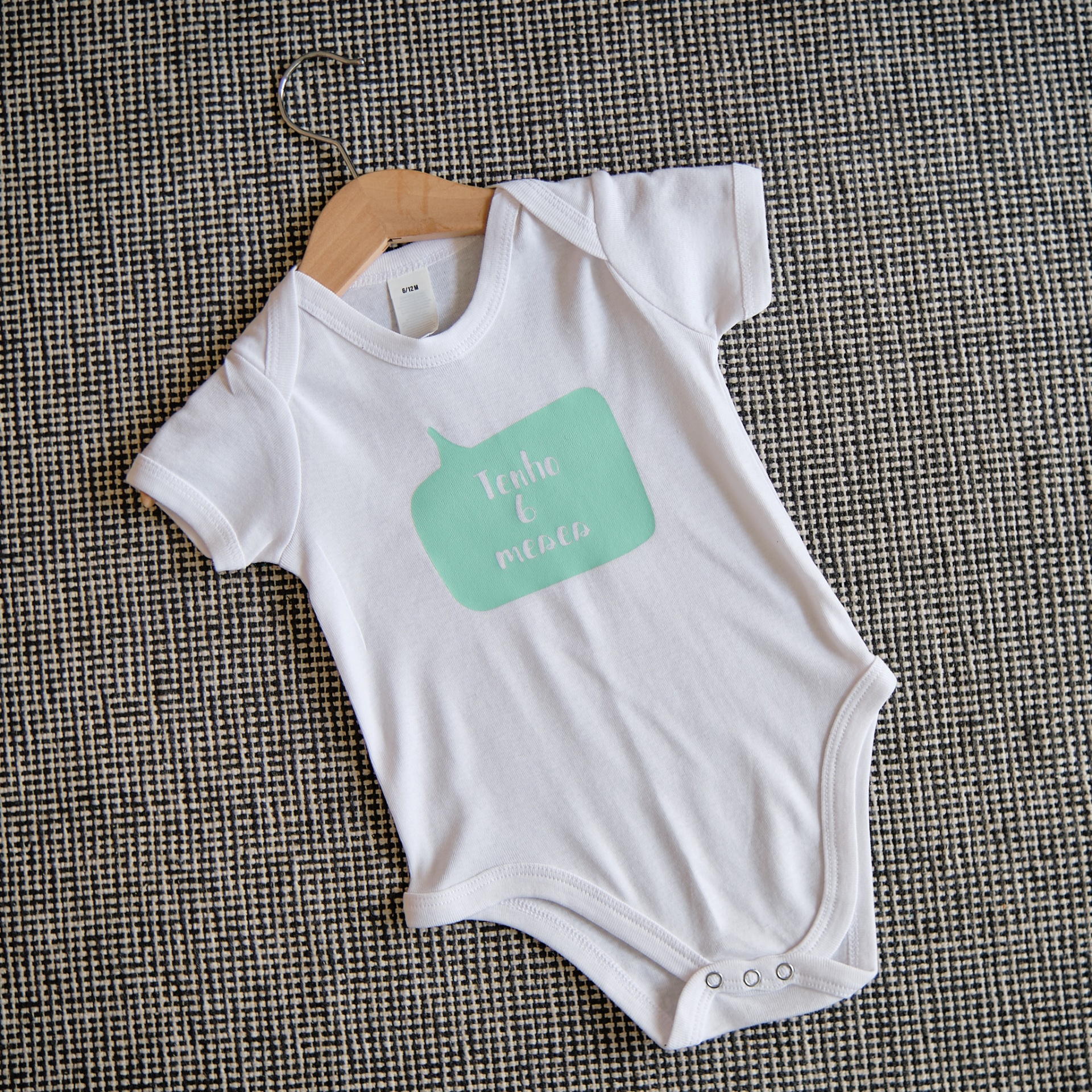 • Body branco de bebé com texto amarelo e branco em superfície de tecido cinzento