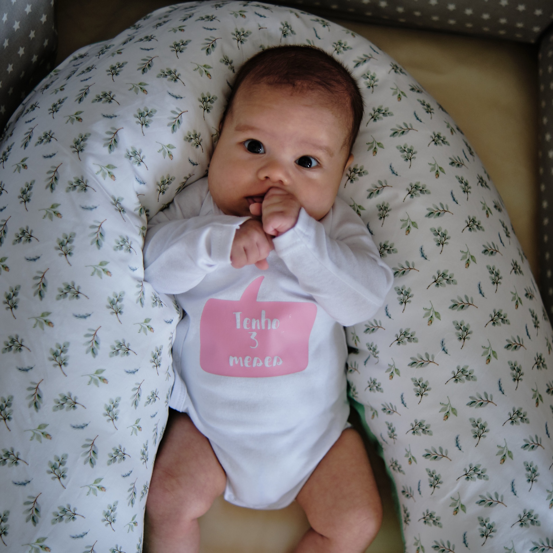 • Bebé de 3 meses vestido com body branco e almofada de amamentação com padrão floral