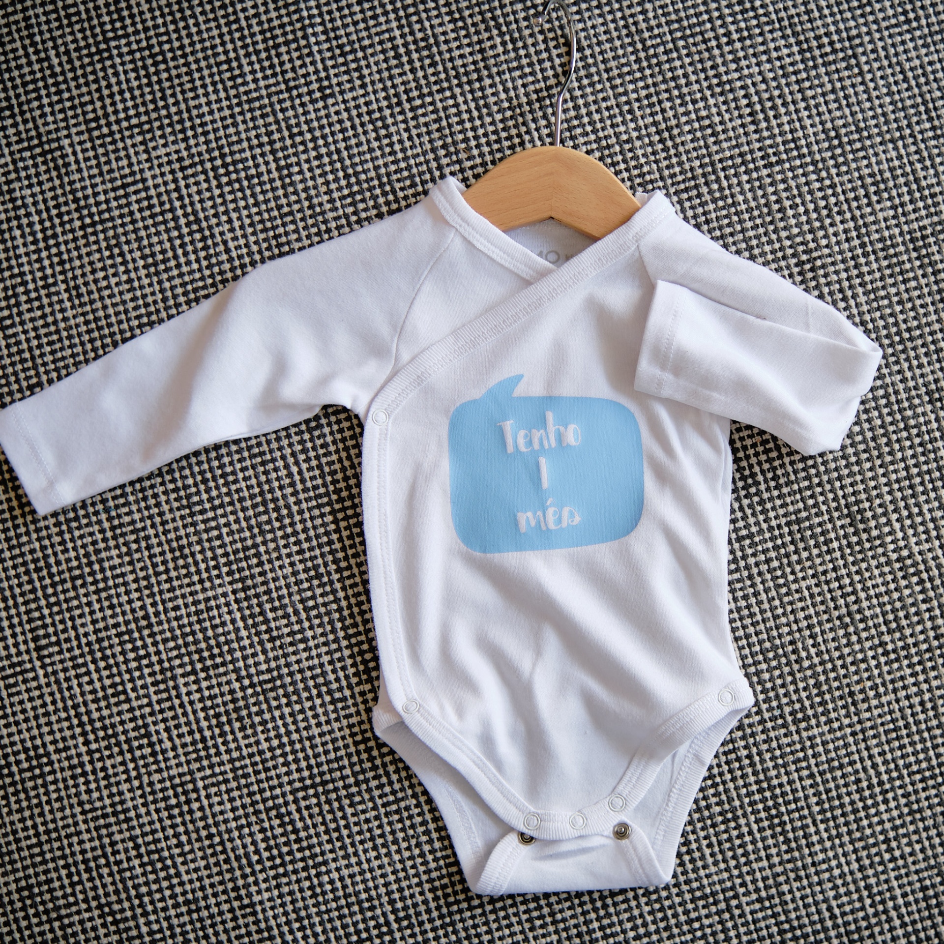 • Body de bebé branco com estampagem azul e texto 'Tenho 1 mês'