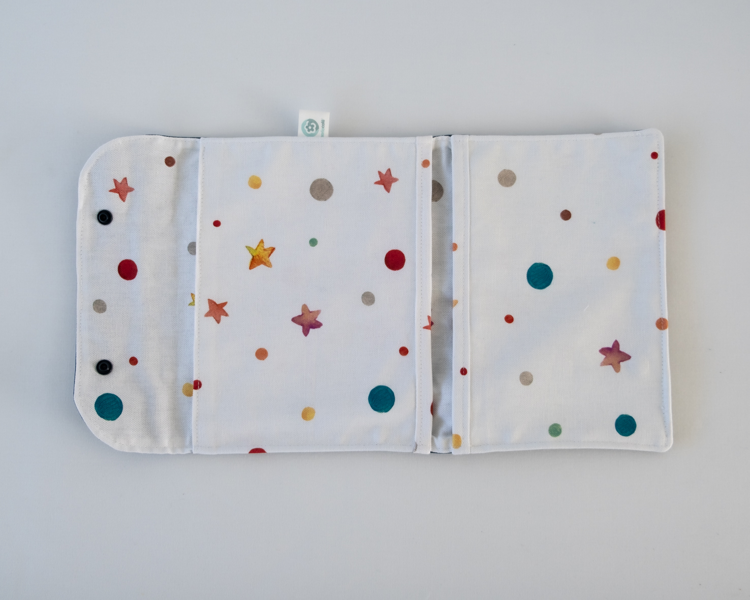 • Carteira de tecido branco com padrão colorido de pontos e estrelas.