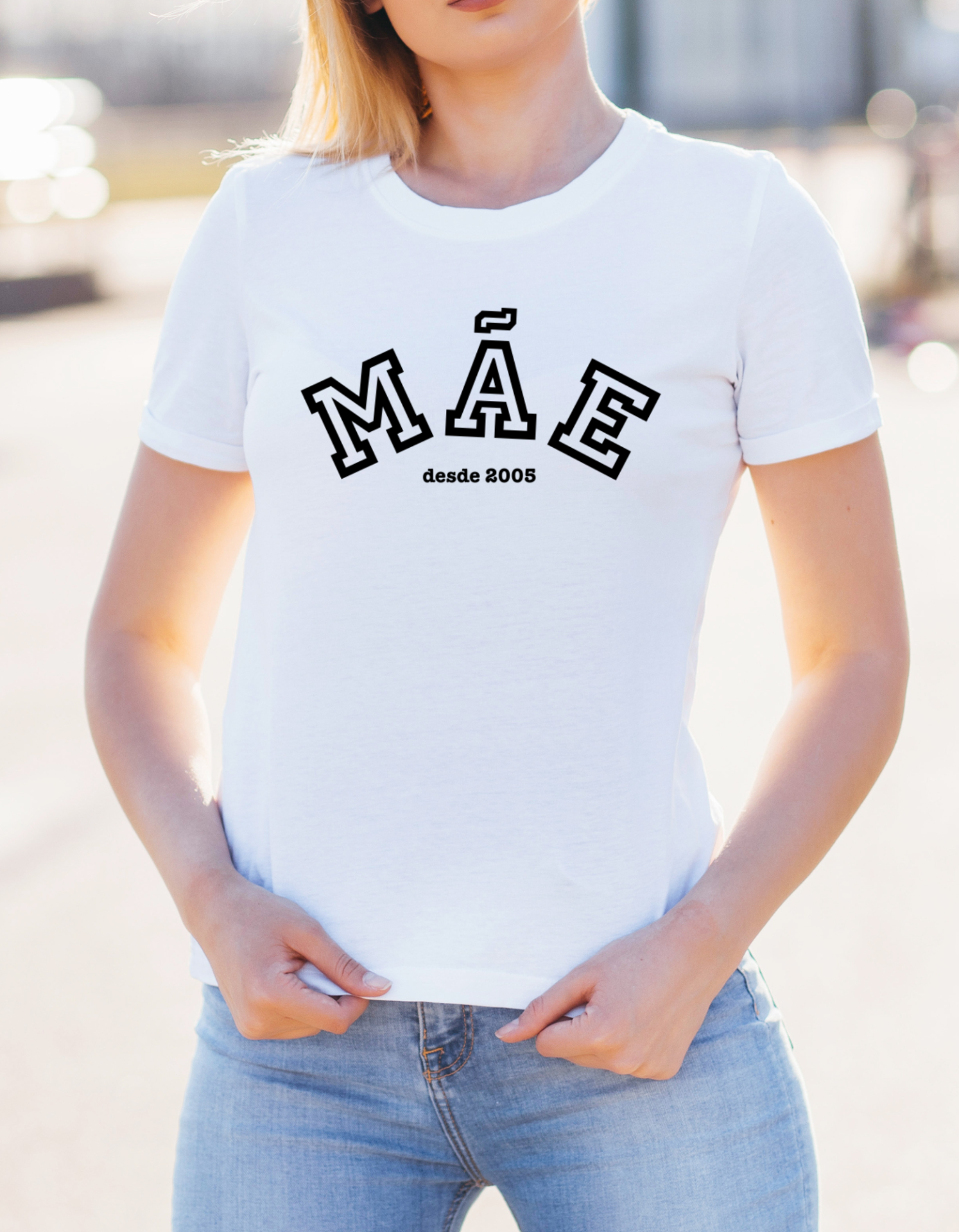 • T-shirt branca com texto preto MÃE desde 2005