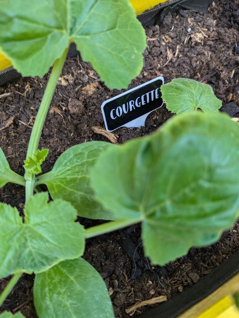• Planta de courgette com etiqueta num recipiente amarelo