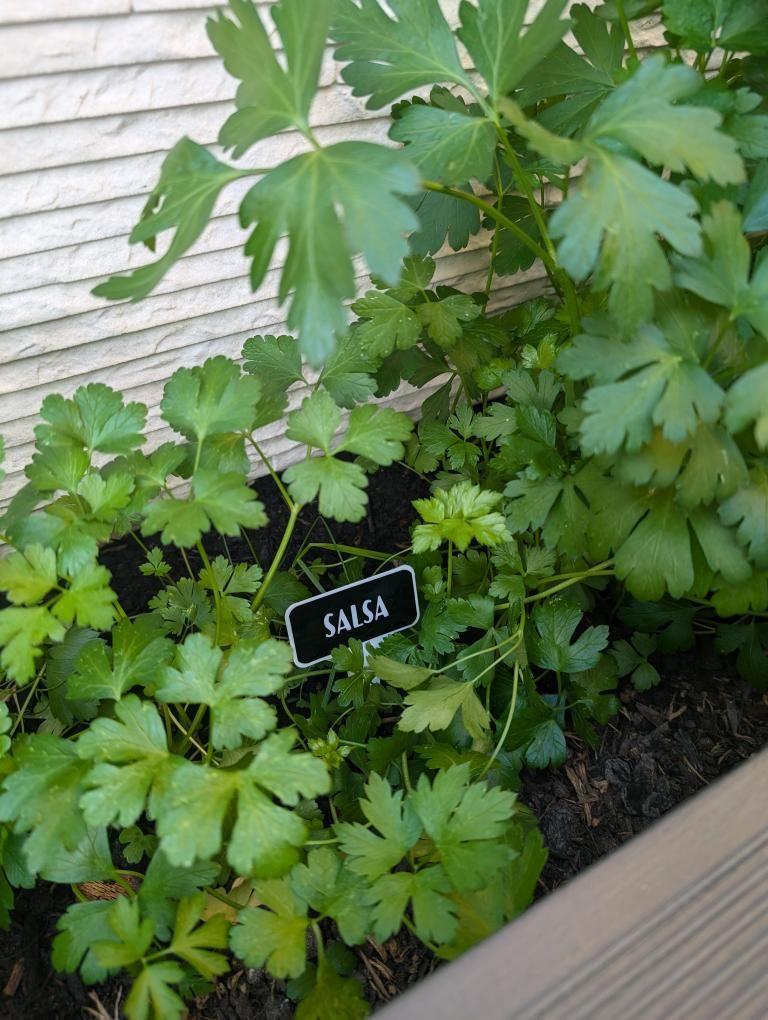• Planta de salsa com folhas verdes em canteiro com etiqueta SALSA