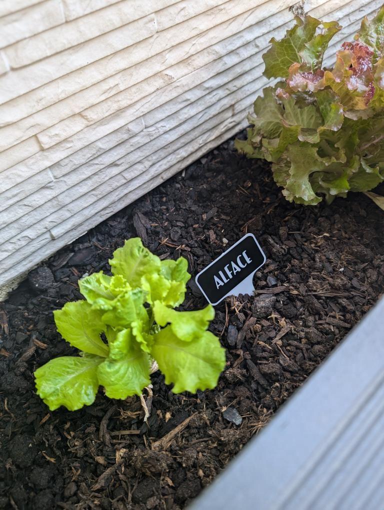 • Planta de alface verde em solo escuro com etiqueta preta escrita ALFACE e alface avermelhada ao fundo