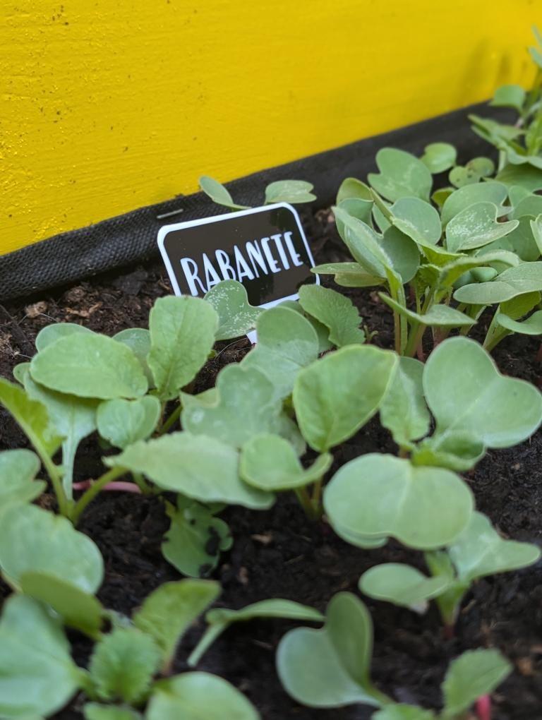• Plantas jovens de rabanete em solo com placa identificativa e fundo amarelo