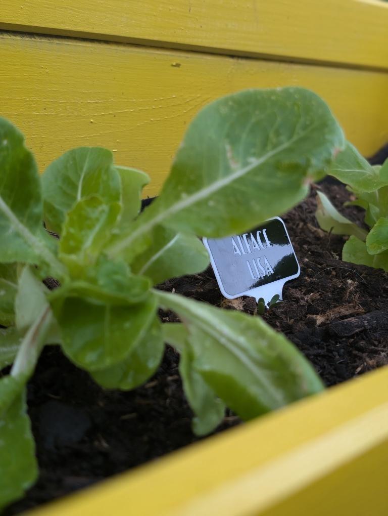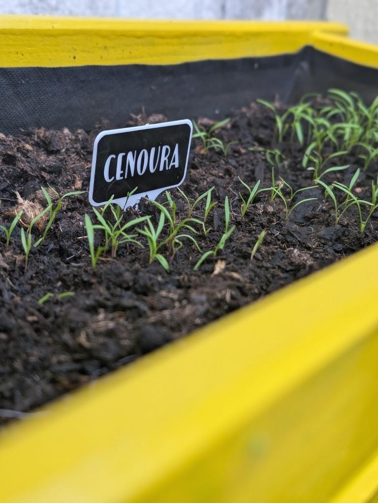 • Caixa de cultivo amarela com plantas de cenoura jovens e placa identificativa