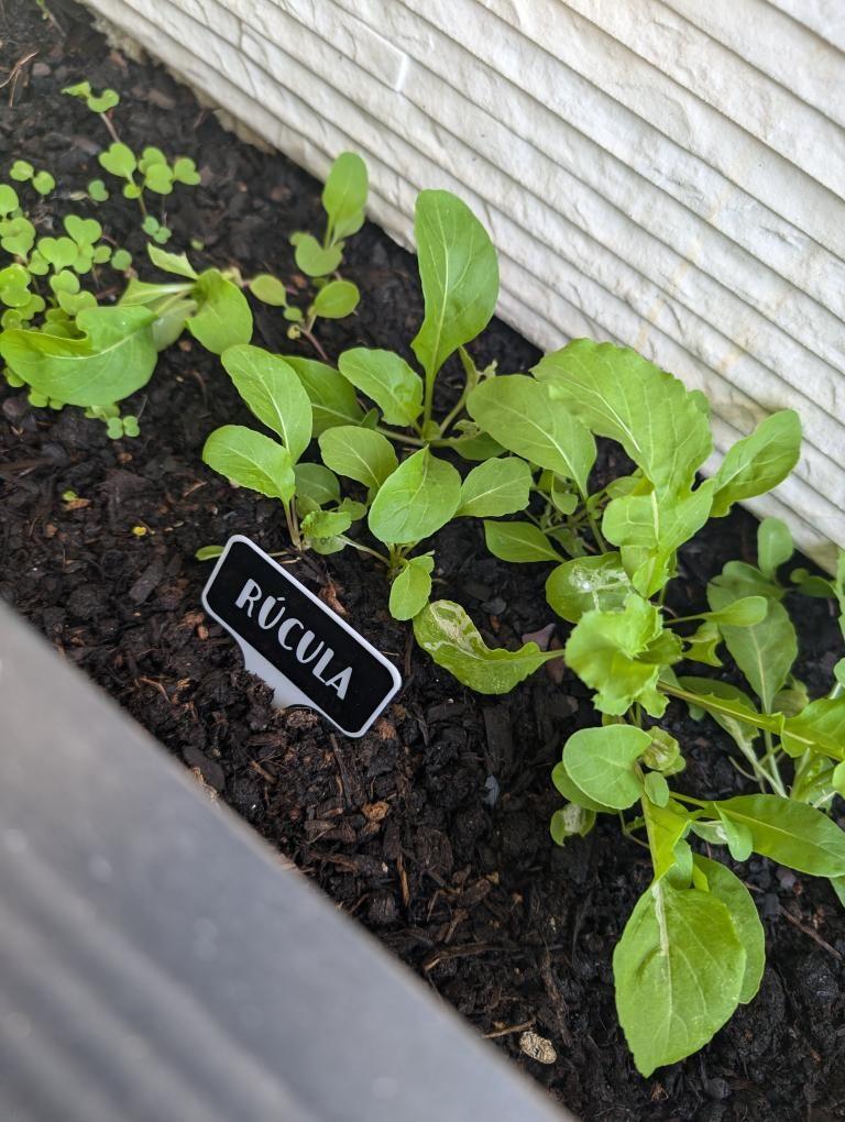 • Planta de rúcula com placa identificadora em cama de terra
