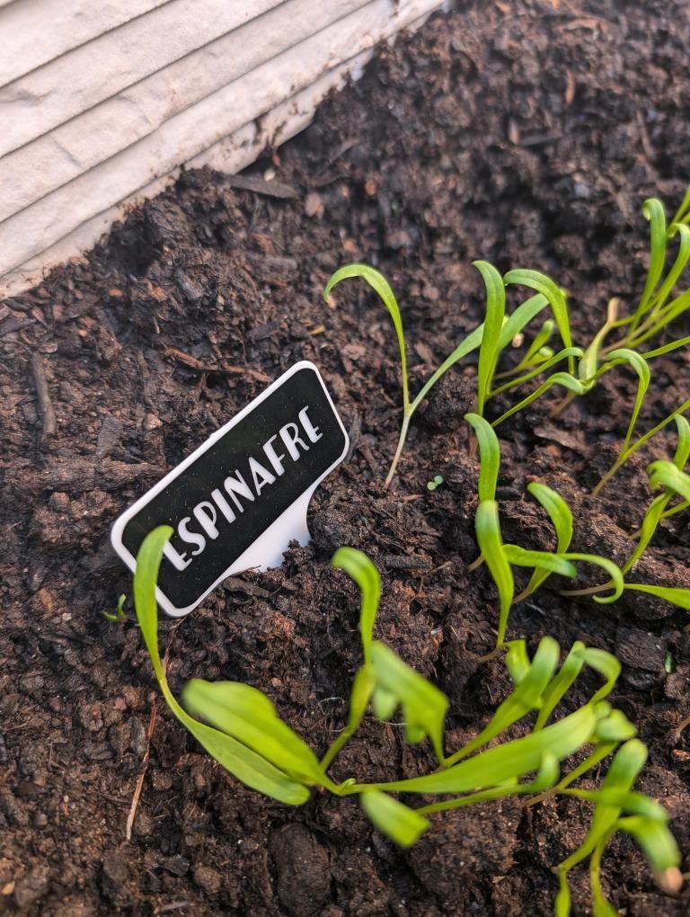 • Planta jovem de espinafre com etiqueta preta que diz ESPINAFRE
