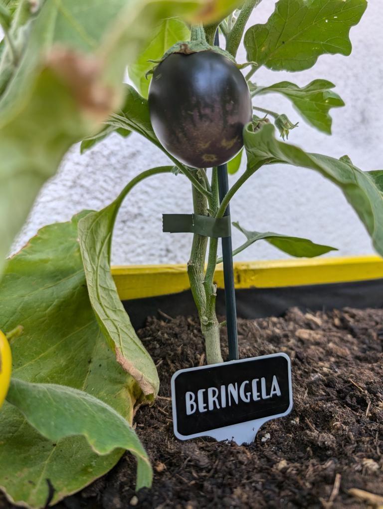 • Beringela preta numa planta com etiqueta na terra