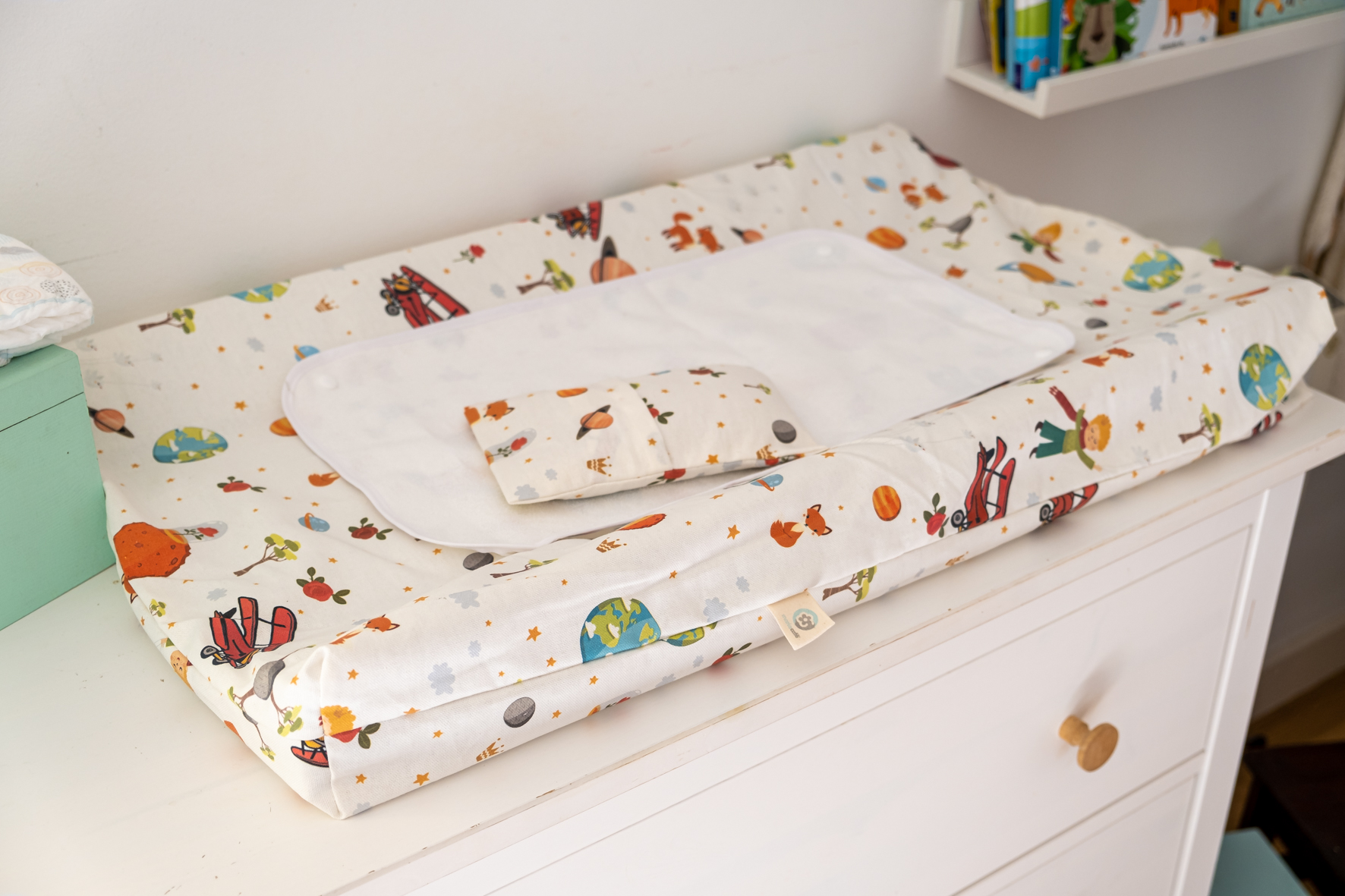 • trocador de bebé com padrão infantil colorido em cima de móvel branco