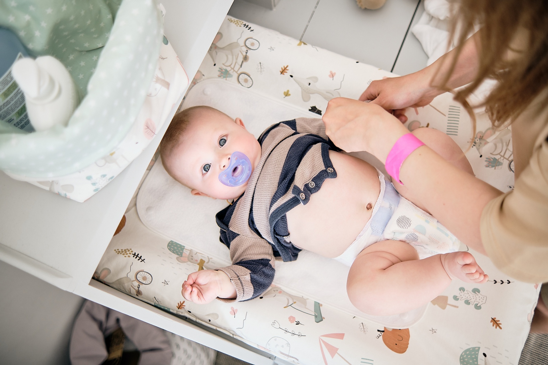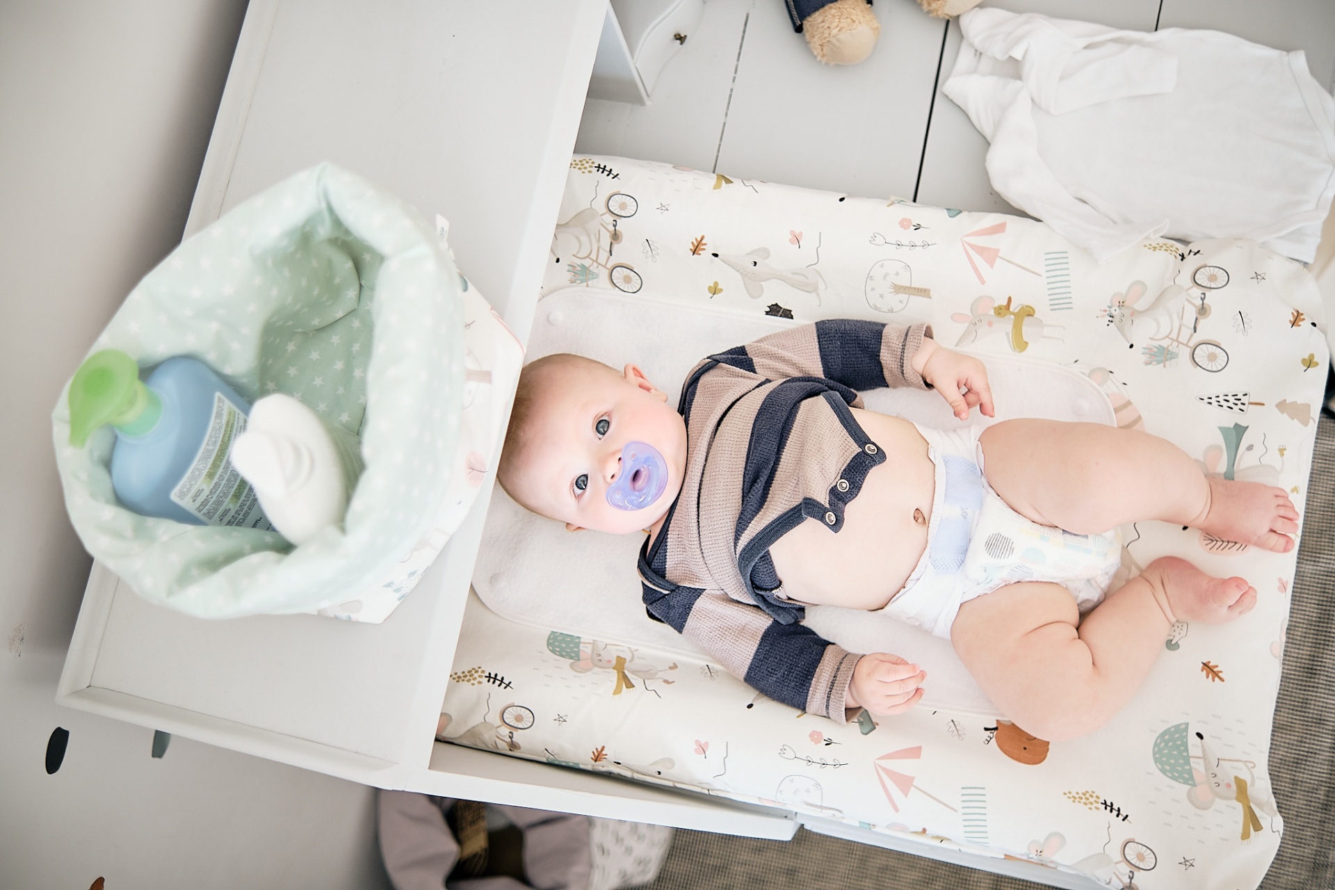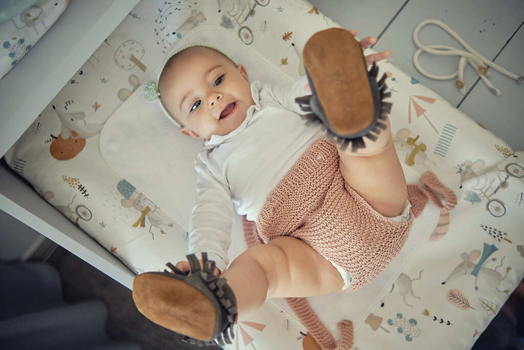 • Bebé deitado numa almofada para mudar fraldas decorada com desenhos infantis, perto de cabaz têxtil verde com produtos para bebé