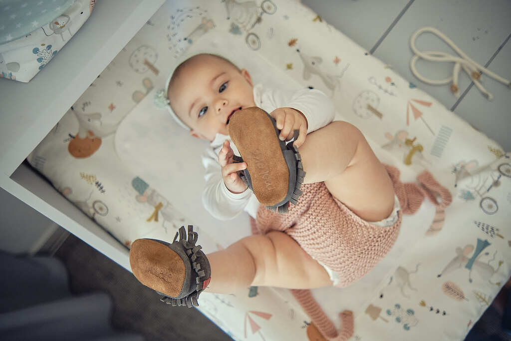 Bebé deitado com roupa clara e sapatinhos castanhos com franjas num colchão estampado