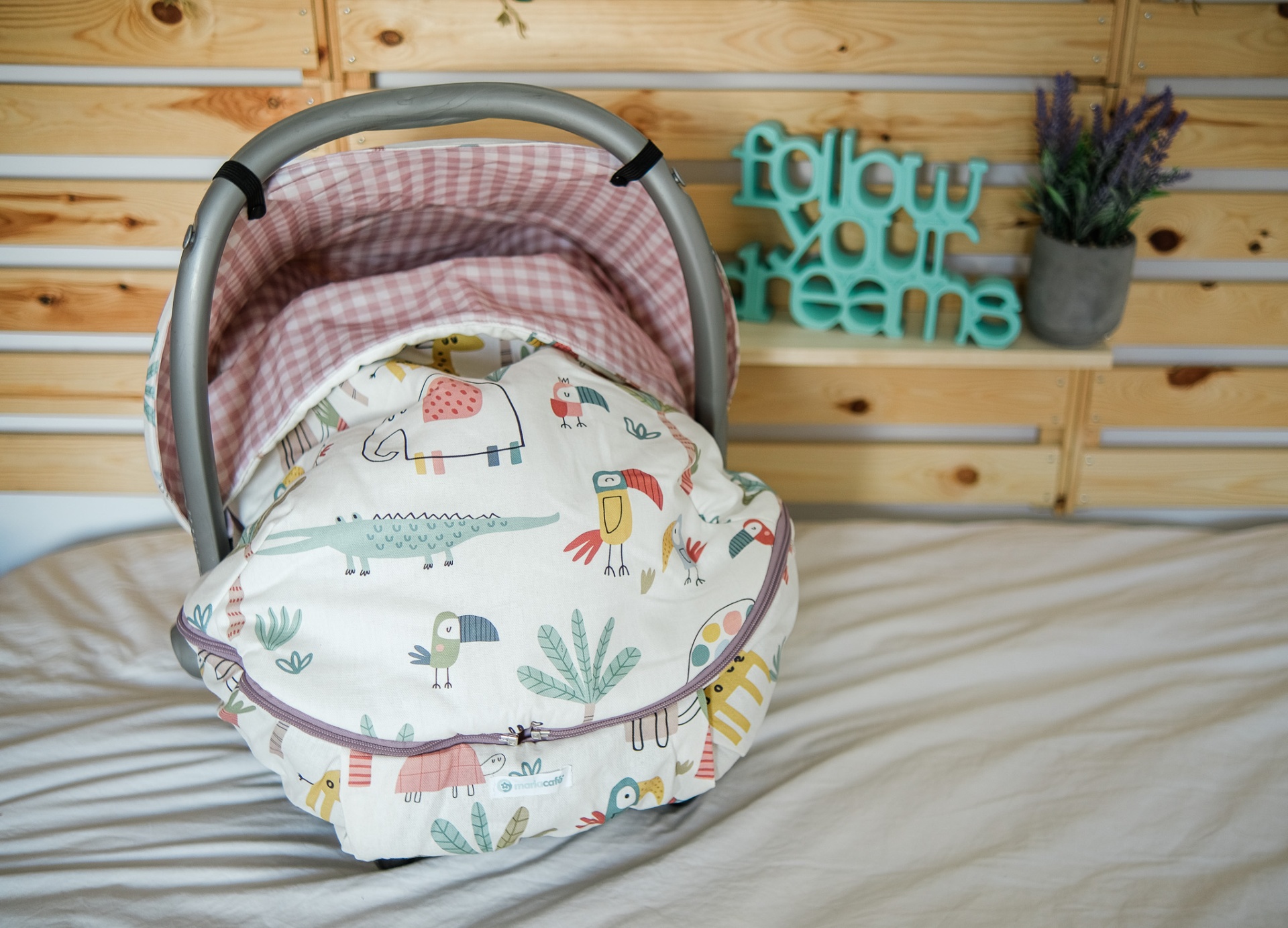 • Cadeira de bebé para carro com tecido interior branco com desenhos de animais e exterior laranja, sobre cama branca e painel de madeira ao fundo.