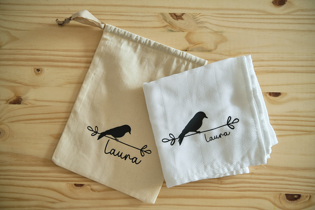 • Pano branco com estampa de pássaro e nome Laura sobre mesa de madeira
