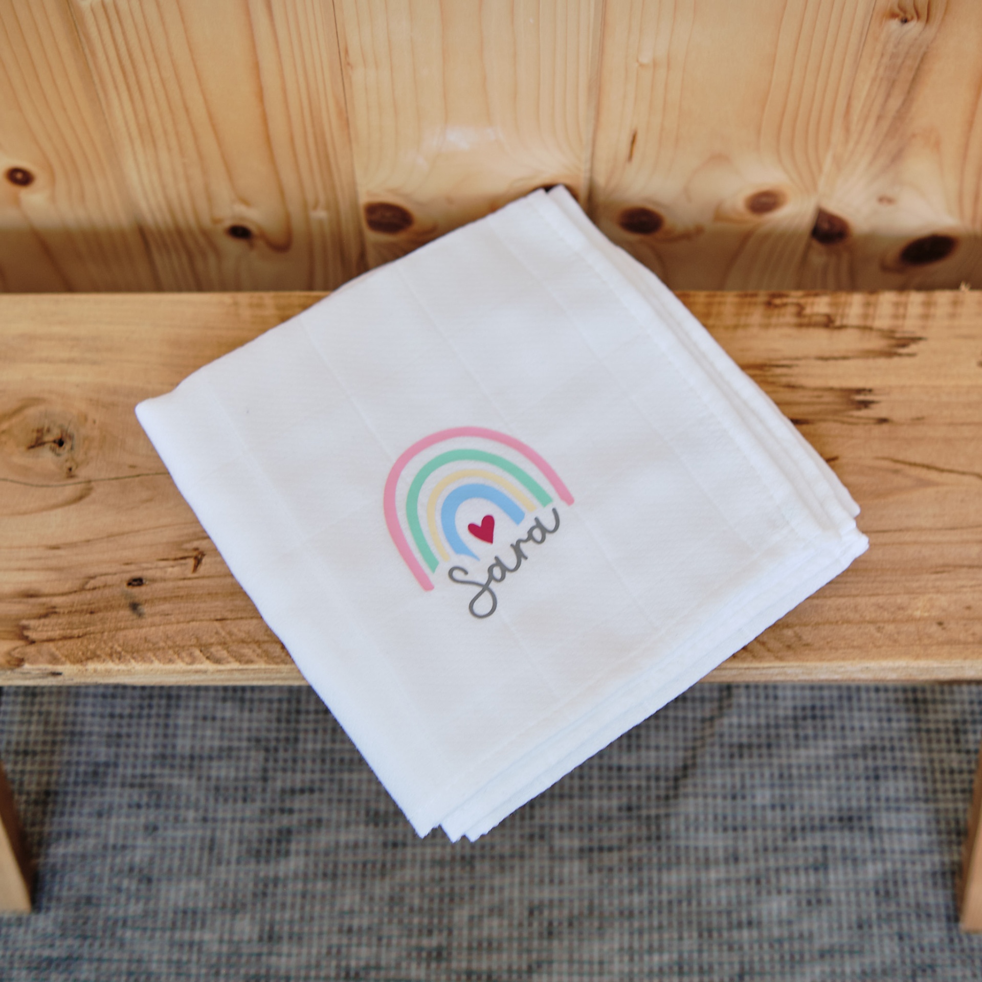 • Fralda branca com arco-íris colorido e nome Sara sobre banco de madeira