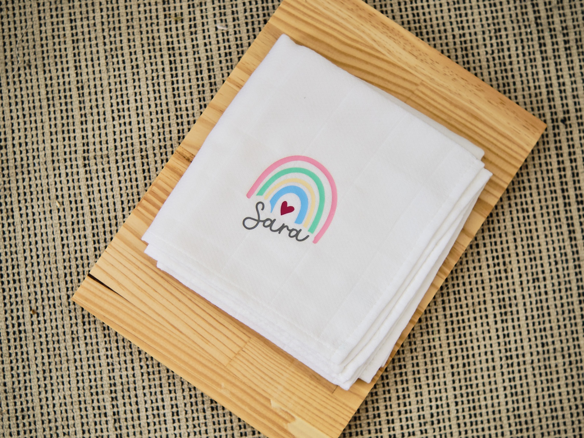 • Fralda branca com arco-íris colorido e nome Sara, sobre tabuleiro de madeira
