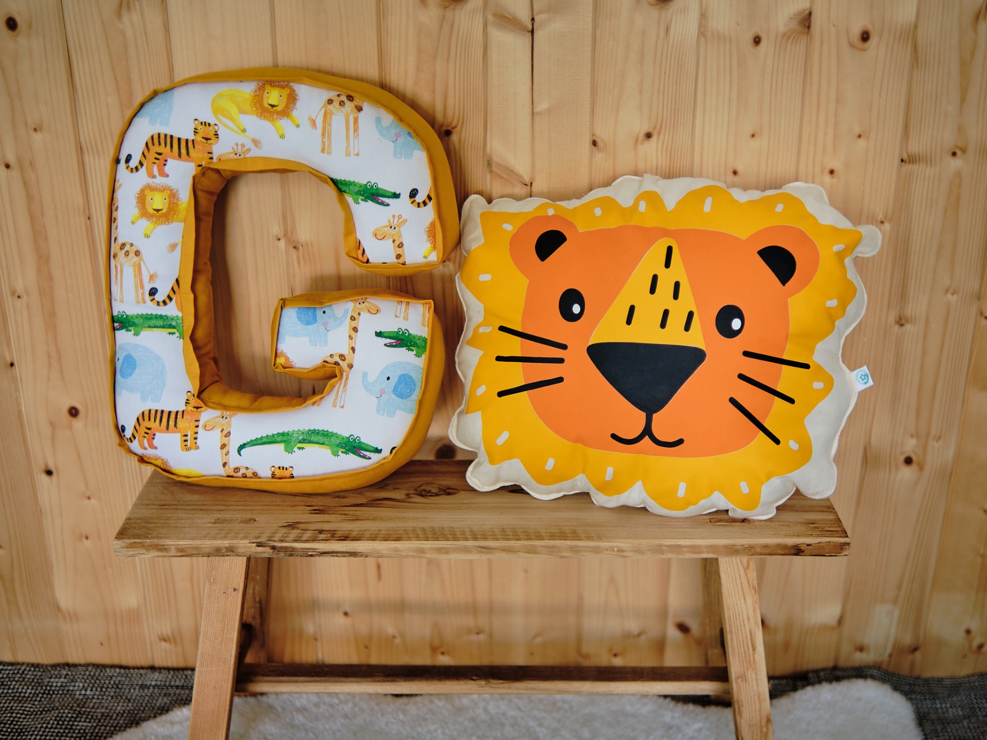 • Almofadas de girafa, zebra e leão encostadas numa parede de madeira