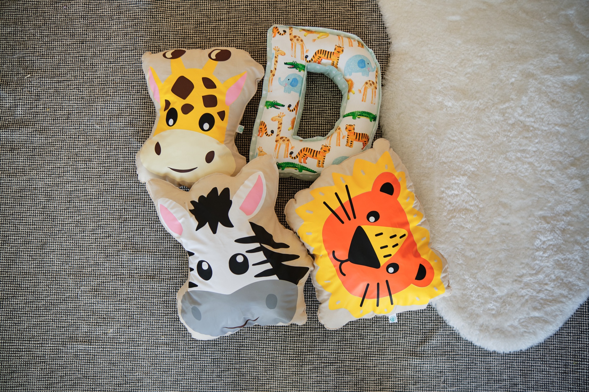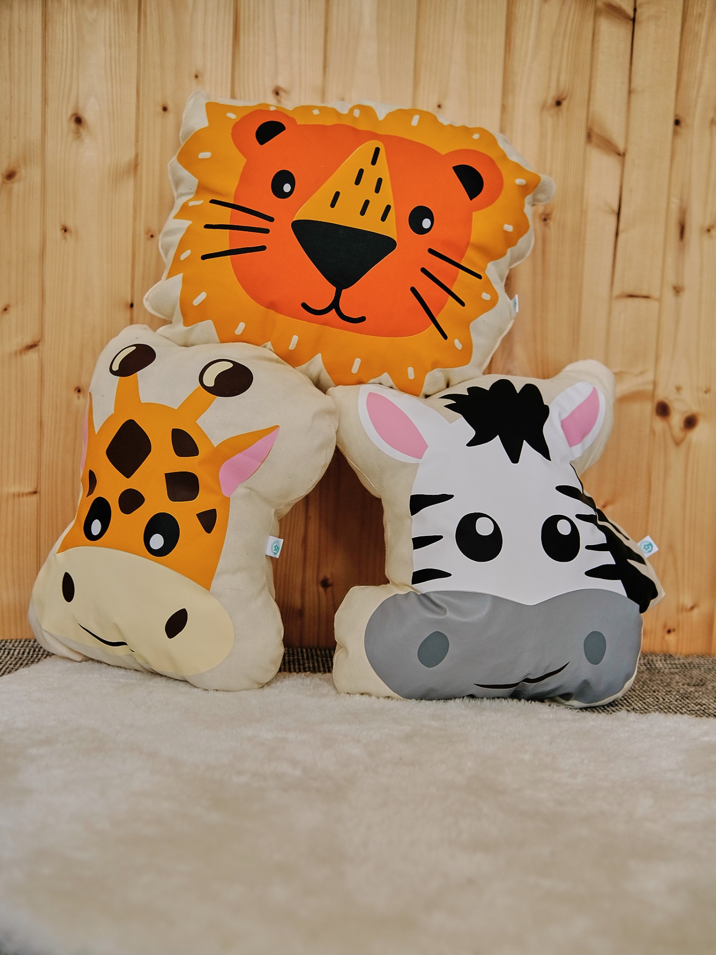 • Três almofadas de pelúcia com desenhos de leão, girafa e zebra sobre superfície clara e fundo de madeira