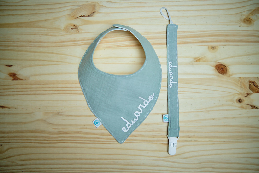 Inclui um babete bandana ou redondo + 1 fita de chucha, ambos em musselina da mesma cor.
