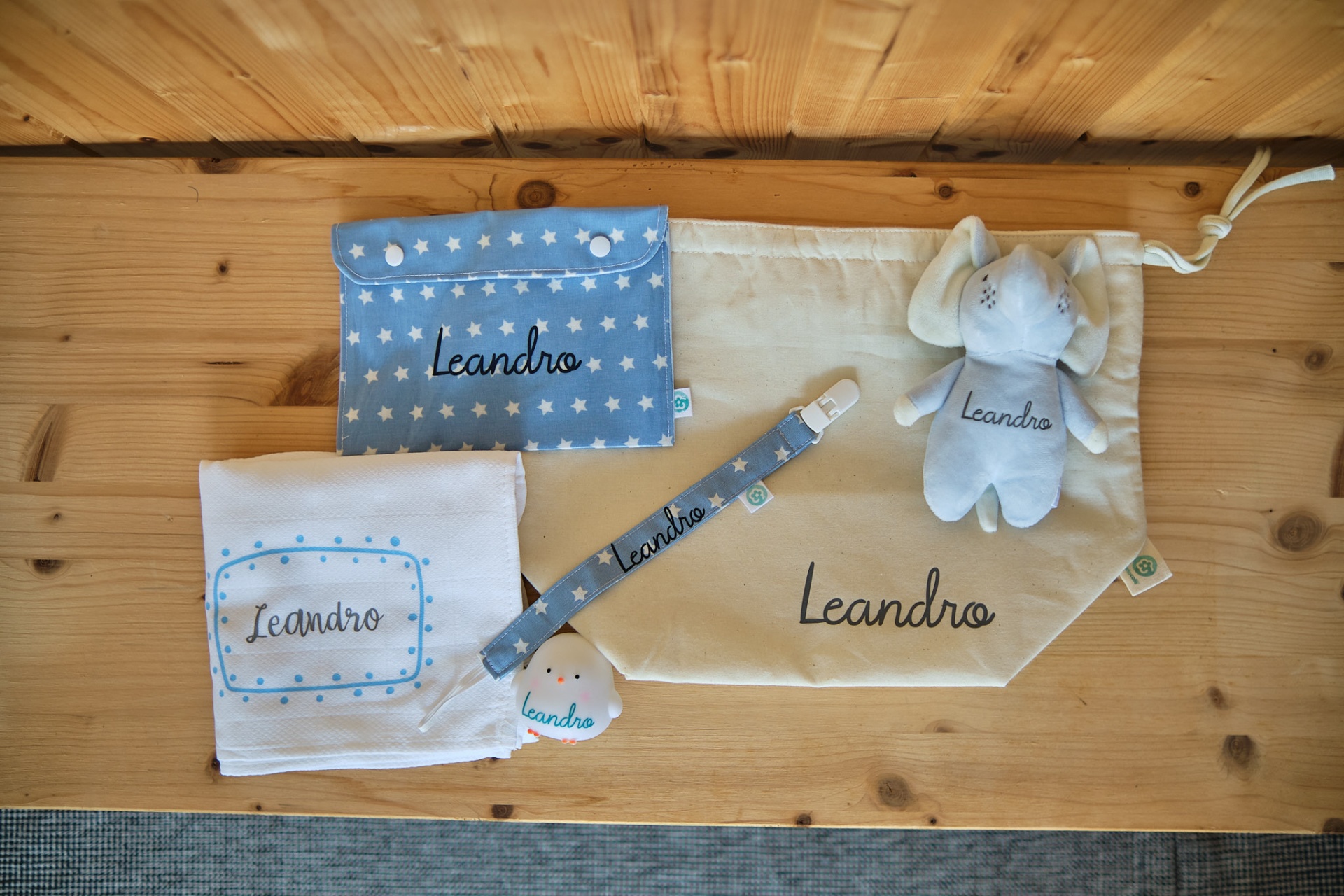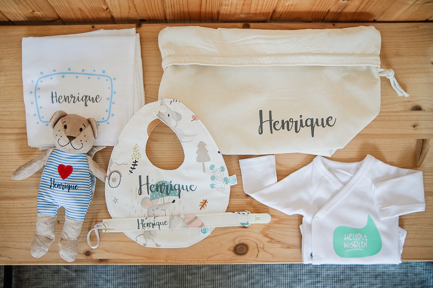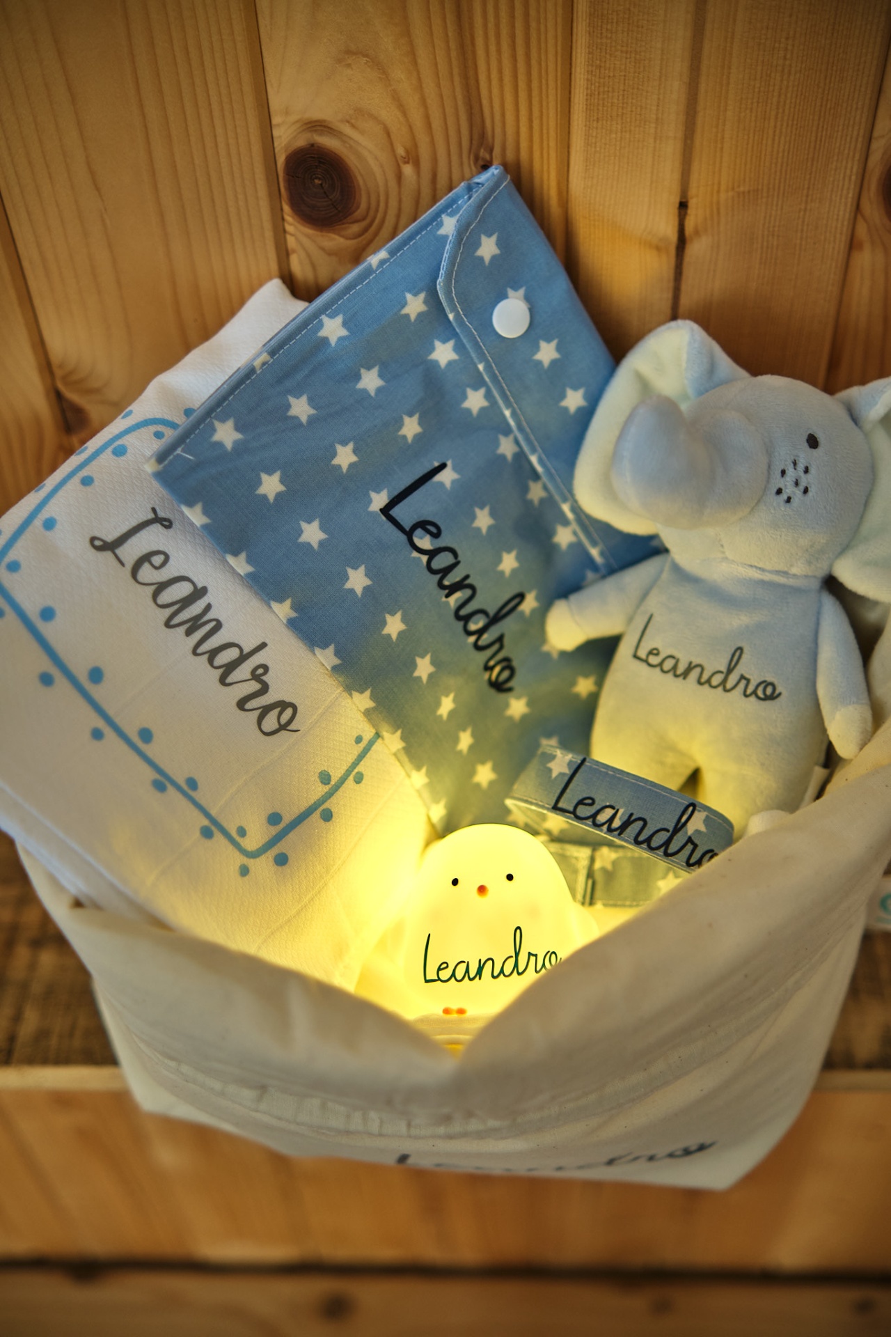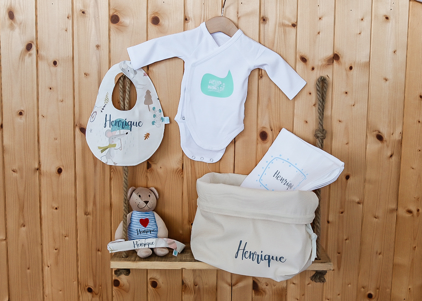 A base é um cesto em tecido que pode ser usado para ter em cima do trocador com alguns essencias para a muda da fralda ou como um necessaire para levar dentro da mala. Personalizado com o nome do bebé, é um presente que o vai acompanhar durante muito tempo.
