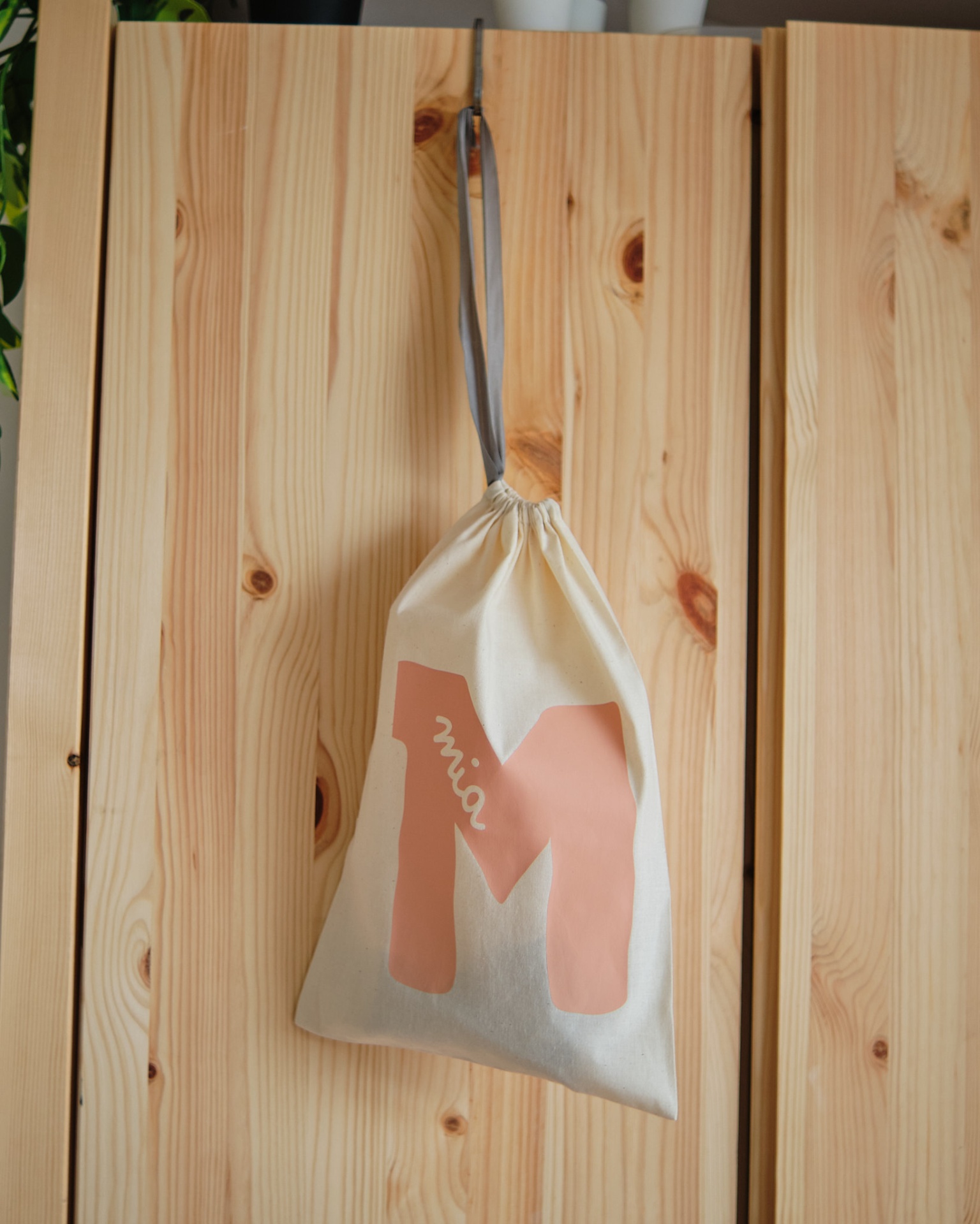 • Saco de algodão com letra M rosa pendurado em parede de madeira