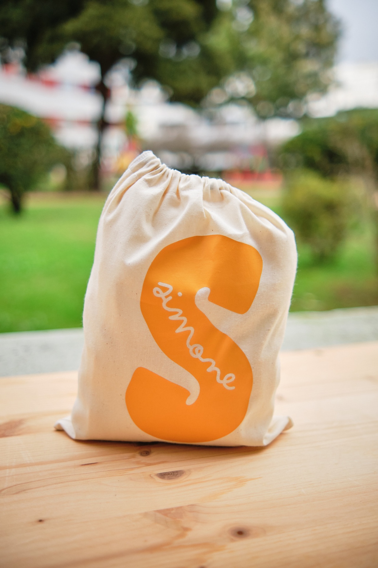• Saco de tecido crú com letra S laranja e palavra simone em branco em mesa de madeira ao ar livre