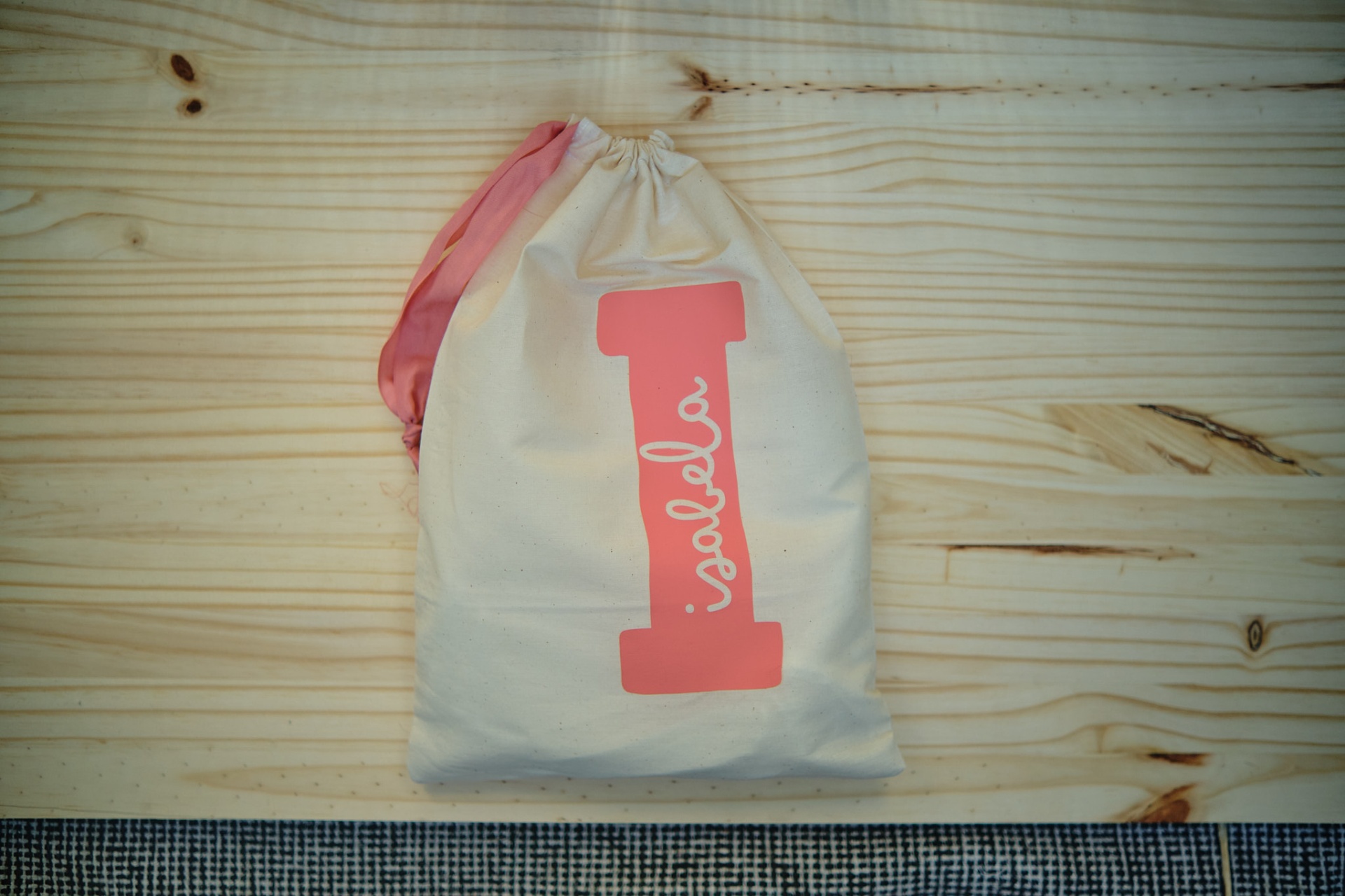 • Saco de tecido bege com estampa rosa e branca, sobre madeira clara