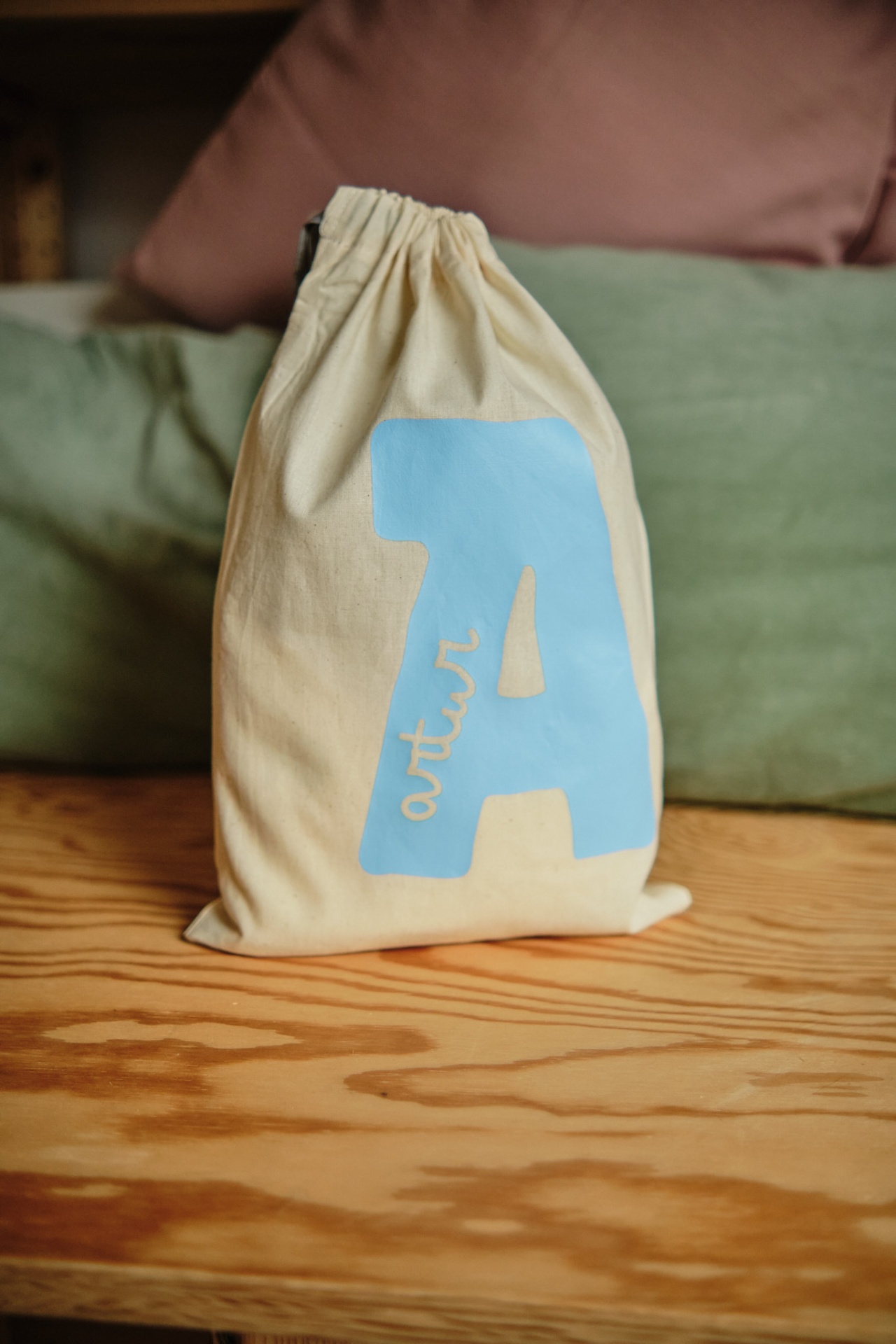 • Saco de pano bege com letra A azul e palavra artur em amarelo claro