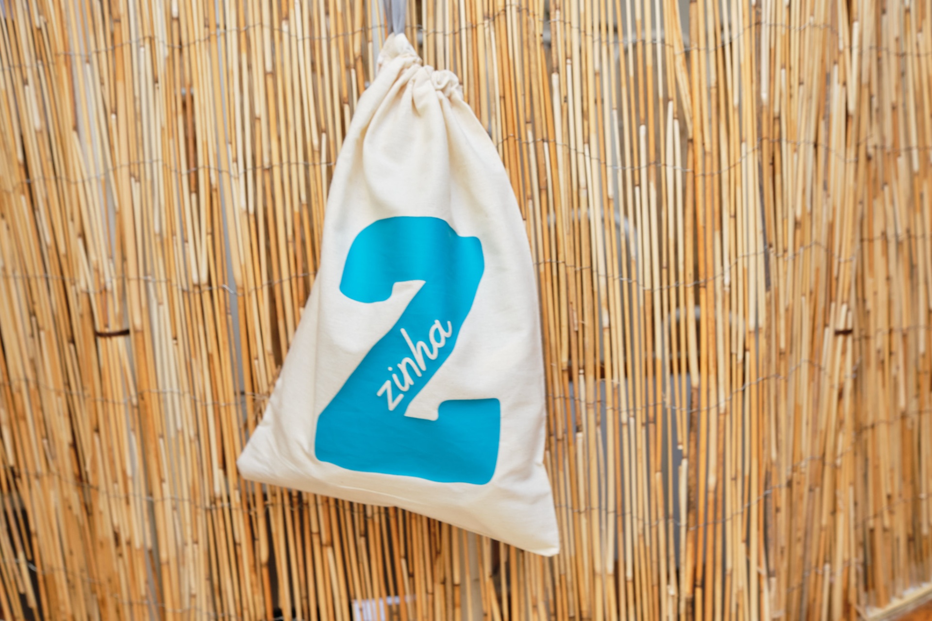 • Saco de tecido branco com número 2 azul pendurado numa parede de palha