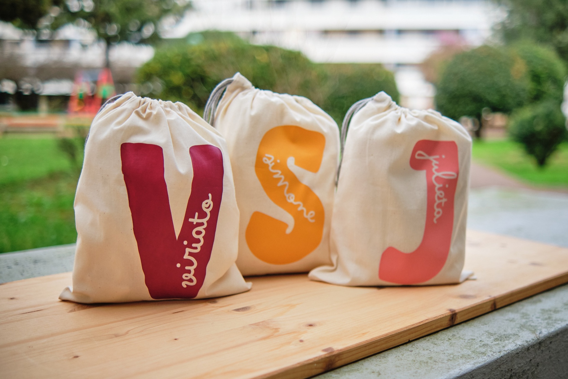 • Três sacos de pano bege com letras V, S e J em cores diferentes e palavras associadas, sobre superfície de madeira em exterior.