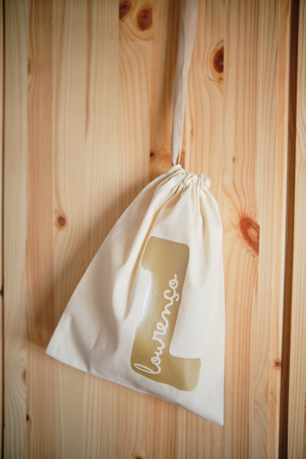 • Saco de pano branco pendurado com número 1 dourado e texto