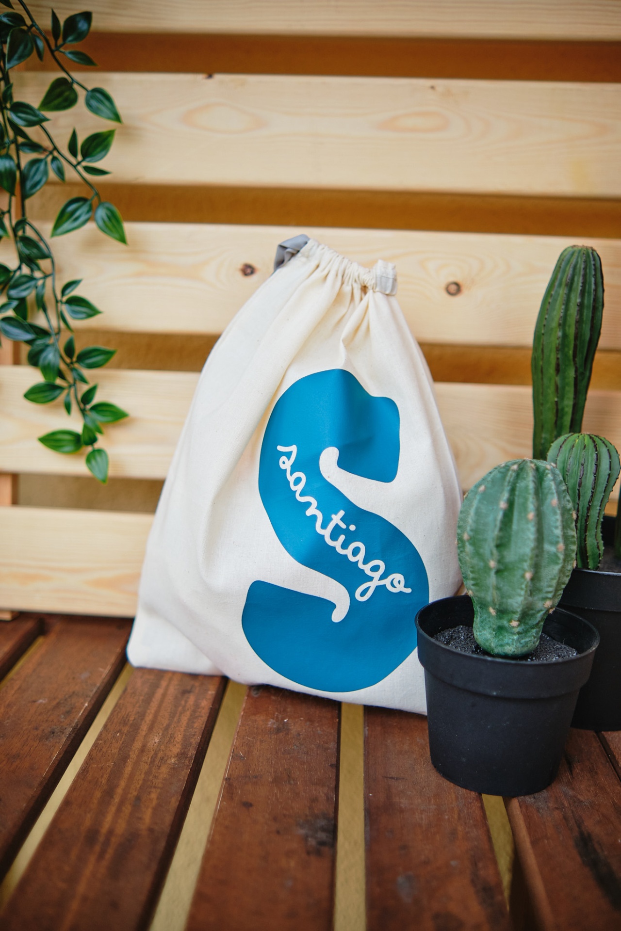 • Saco de pano branco com letra S azul e palavra santiago entre plantas de cacto