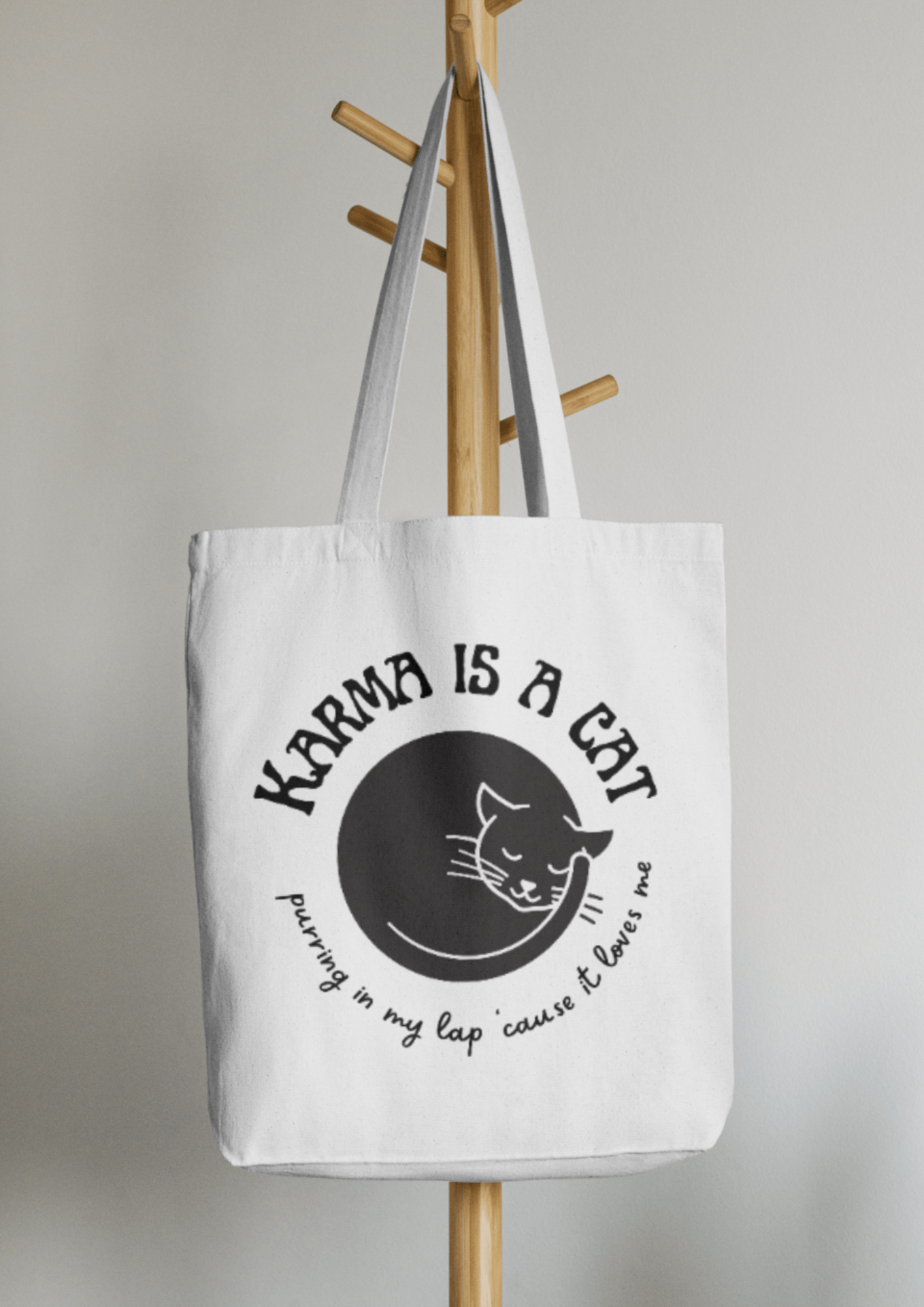 • Saco branco com desenho de gato e texto em preto pendurado em suporte de madeira