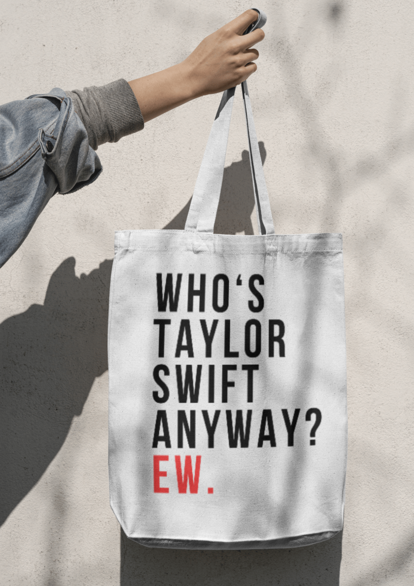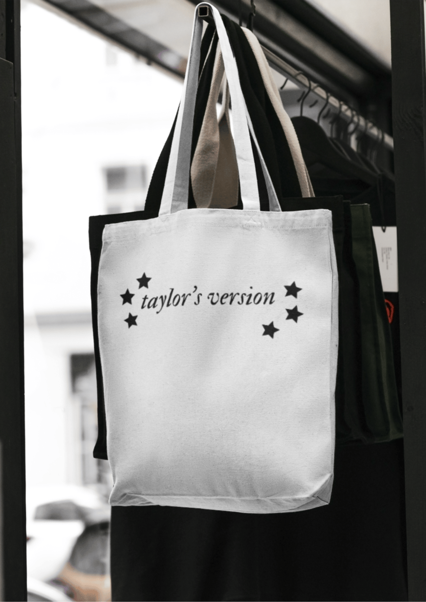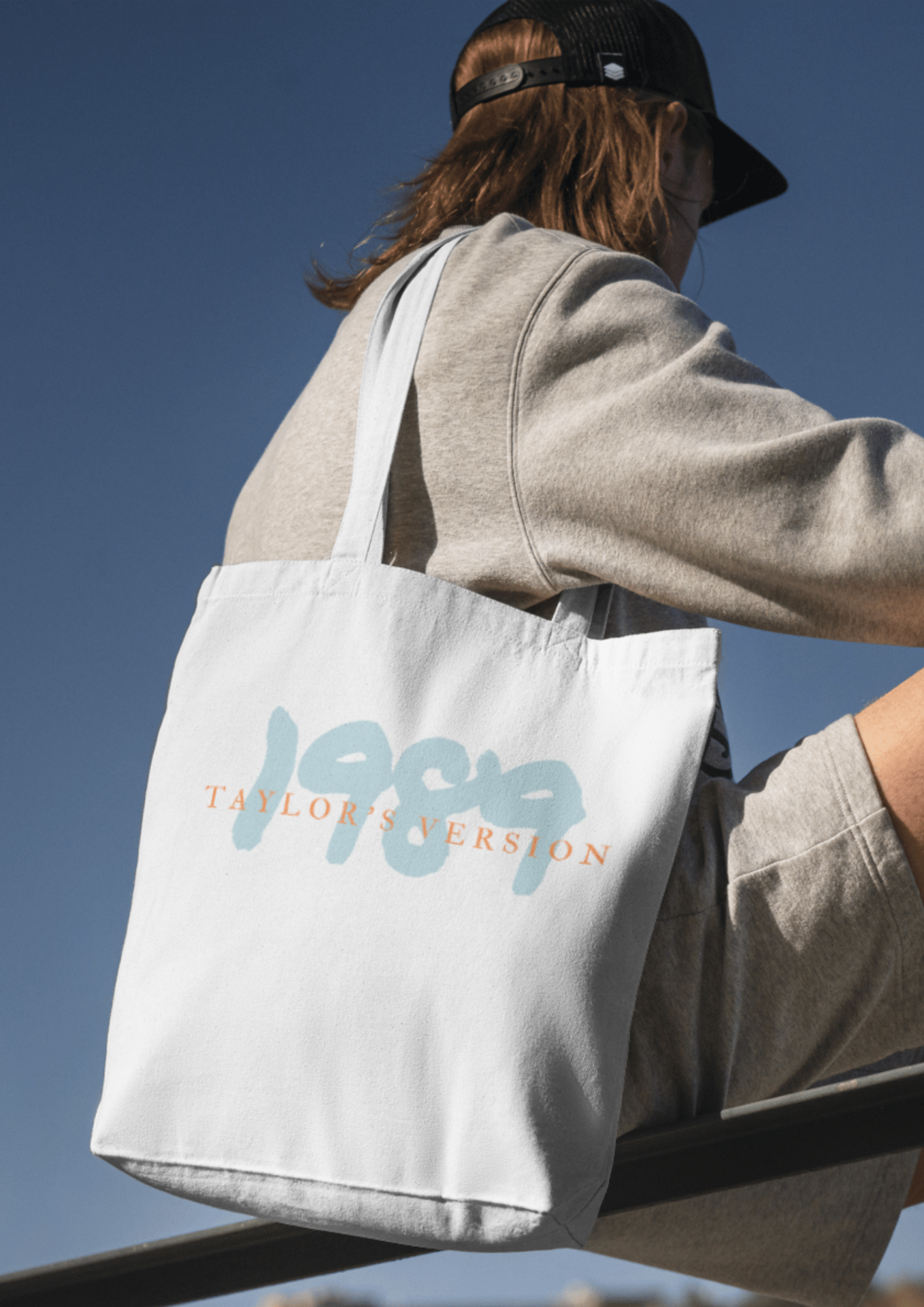 • Saco de lona branco com texto TAYLOR'S VERSION e pessoa com roupa cinzenta ao ar livre